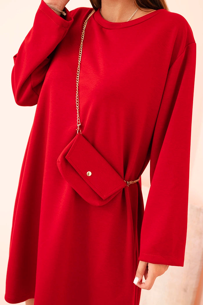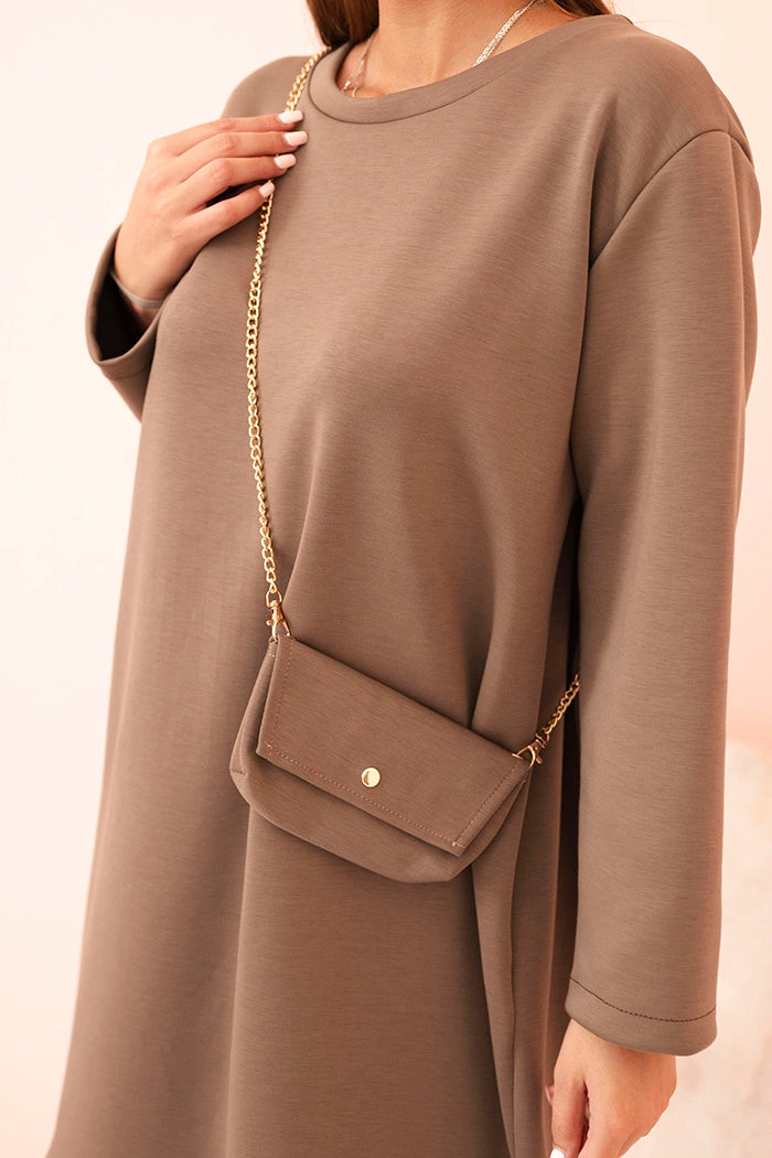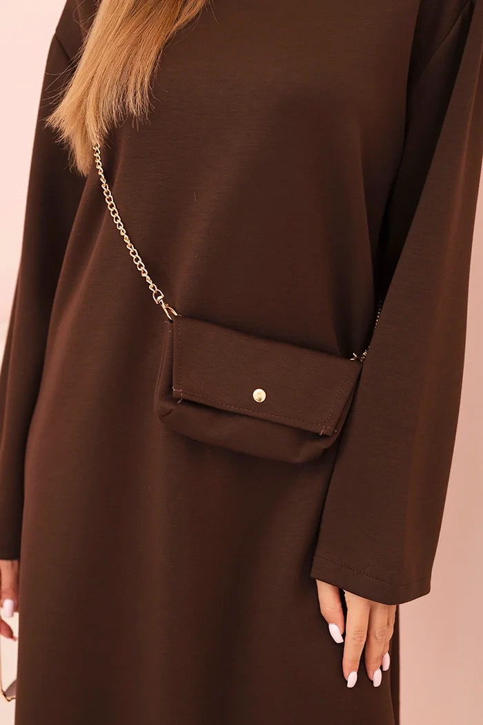 Дамската рокля от вискоза със свободна, семпла кройка е перфектният избор за жени, които ценят комфорта и стила в едно. Комплектът включва модерна чанта с възможност за закопчаване със златна верижка, която добавя модерен характер и практичност към цялото изделие. Роклята е изработена от мек и еластичен материал, който перфектно приляга по силуета и осигурява комфорт през целия ден.
