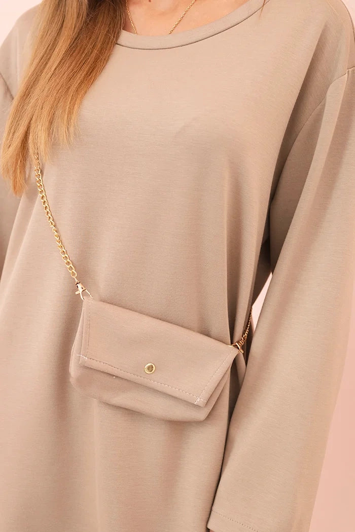 Детайли: чанта със златна верижка, дълъг ръкав, кръгло деколте