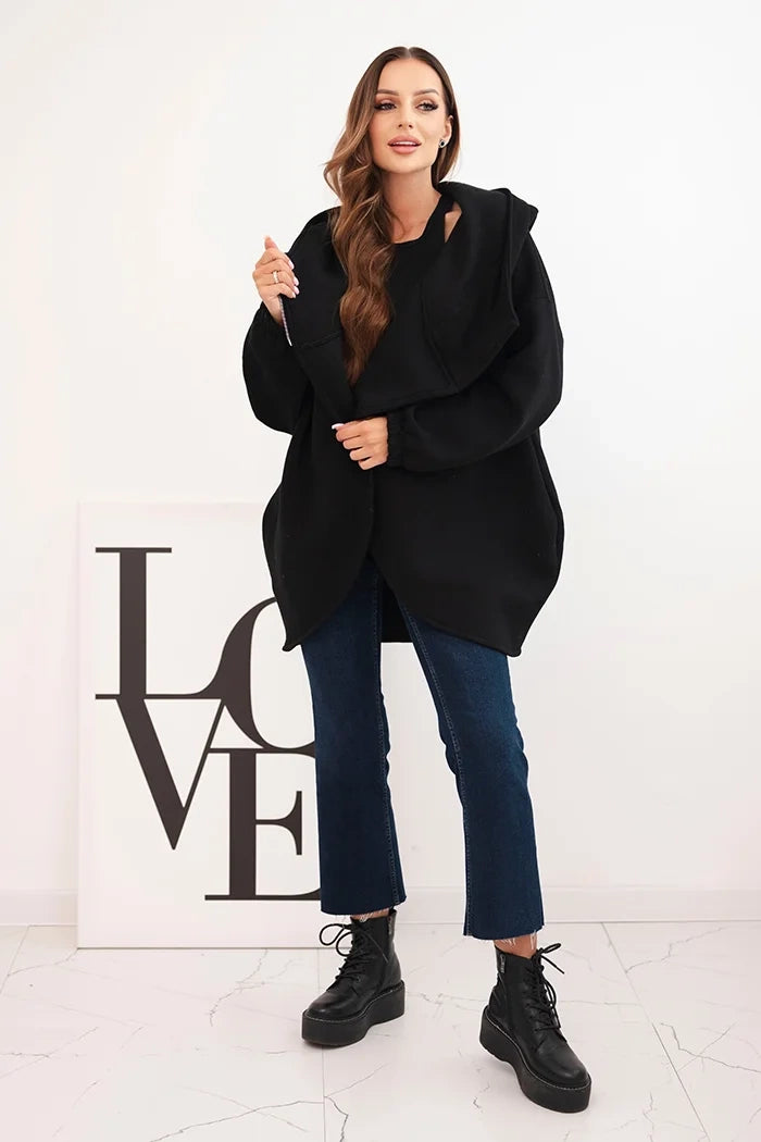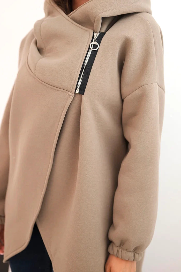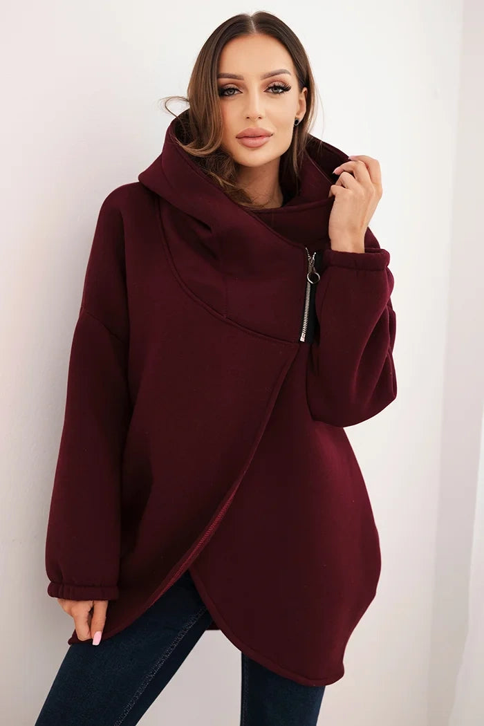 Този дамски суичър с качулка с изолация е отличен избор за студените дни – съчетава комфорт с модерен дизайн. Той се отличава с модерна, асиметрична кройка и диагонален цип, който не само служи за практическа цел, но и подчертава уникалния стил на суичъра.