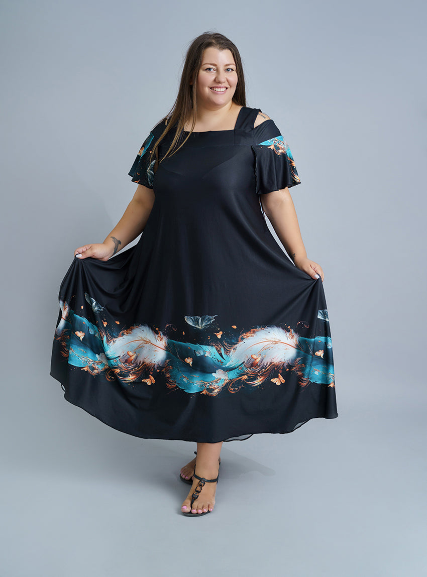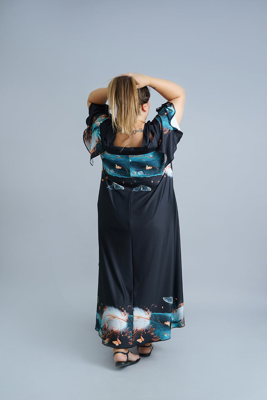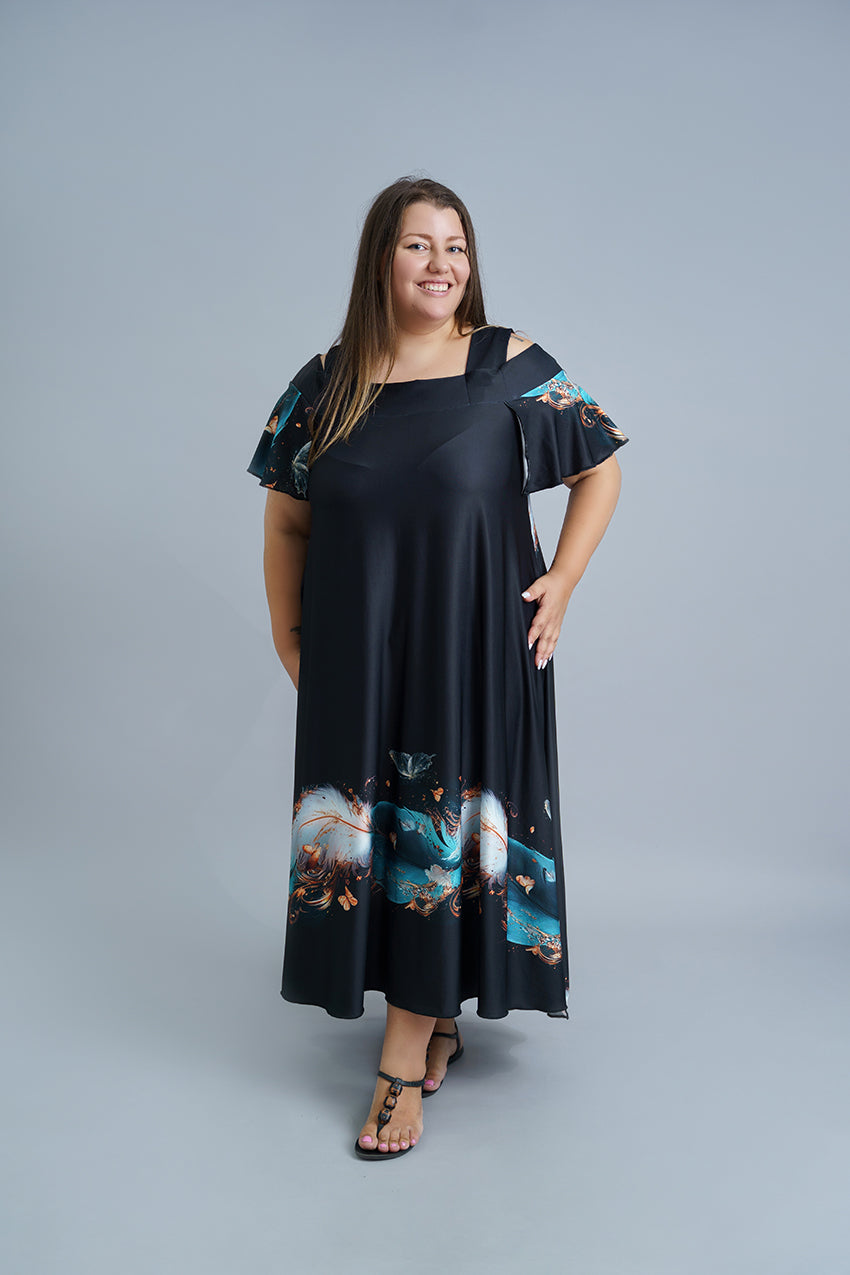 Дълга черна рокля с къс ръкав Мая. Красив разкроен модел с къс ръкав. Еластична и непрозрачна материя.