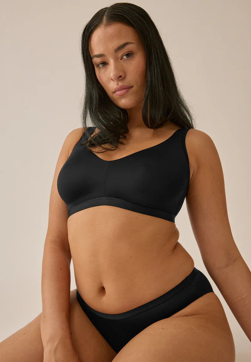 Съвет: Поръчайте с размер по-голяма чашка. Лека като перце функционалност. Без банели или подплънки. Високи, широки презрамки, които се сливат с модерно V-образно деколте. Визуално намалява размера с една чашка.