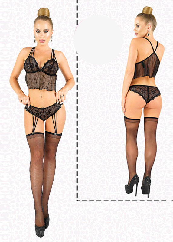 Черен комплект от бюстие с бразилиани 5185. Бюстие от тюл без банели и без подплънки с кръстосани презрамки. Дантелена бразилиана. Комплект от 4 части (бюстие + жартиери + бразилиана, чорапи)