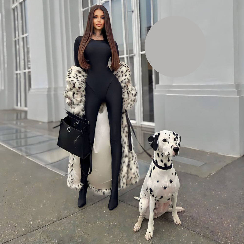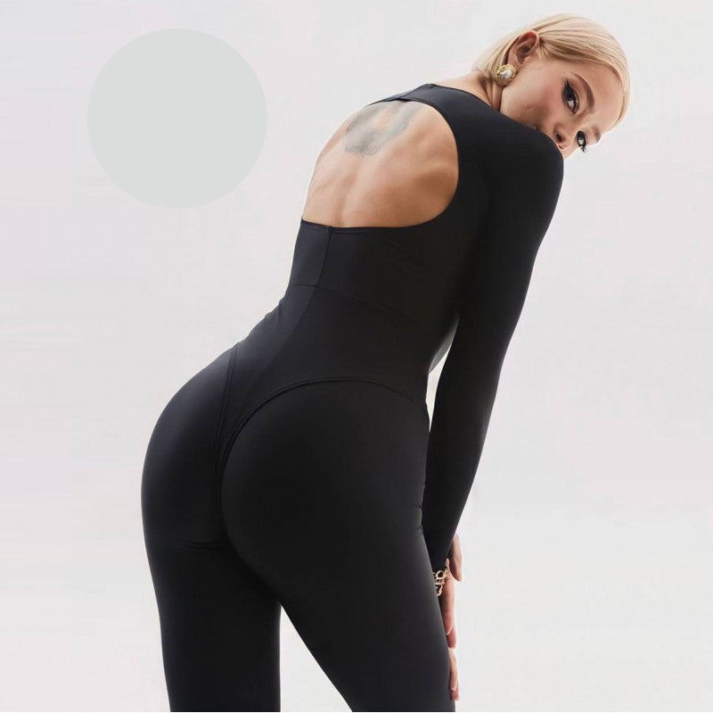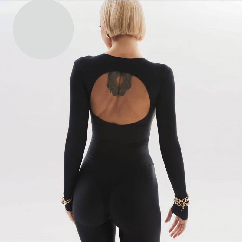 Черен комплект от клин с боди FT-2599. Eластично боди с дълги ръкави и изрязан гръб. Закопчаване тик-так. Плътен клин с висока талия