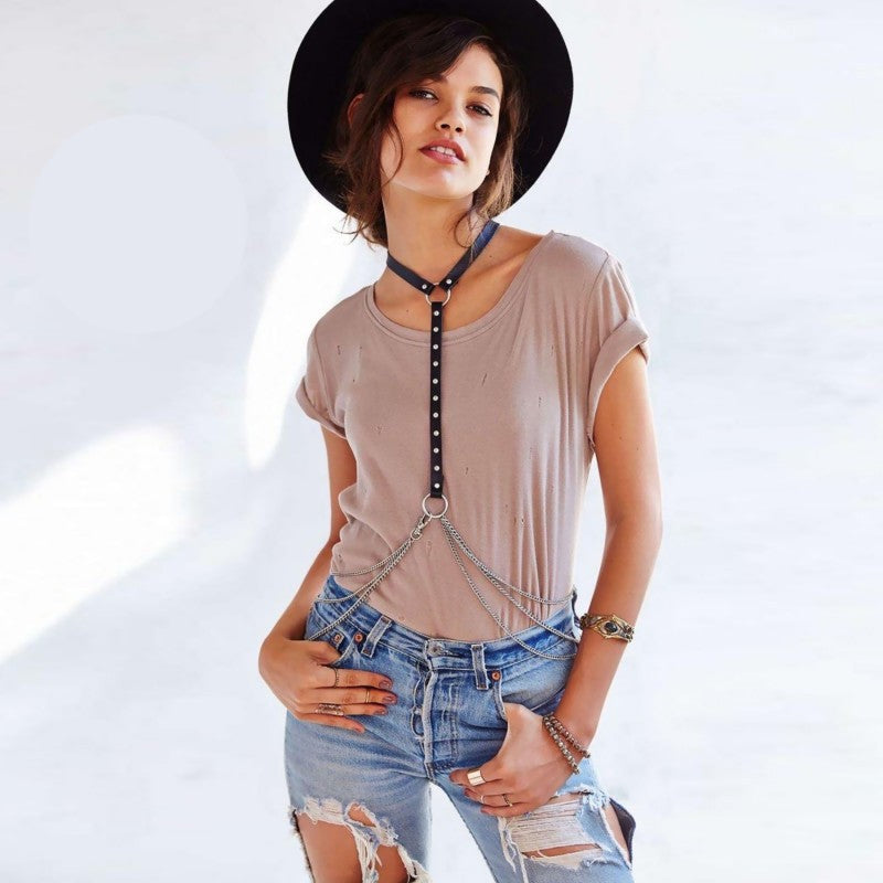Черен кожен харнес със синджири AA-700905. Висококачествена изкуствена кожа. Подвижни синджири . Един размер – подходящ за S, M, L, XL .