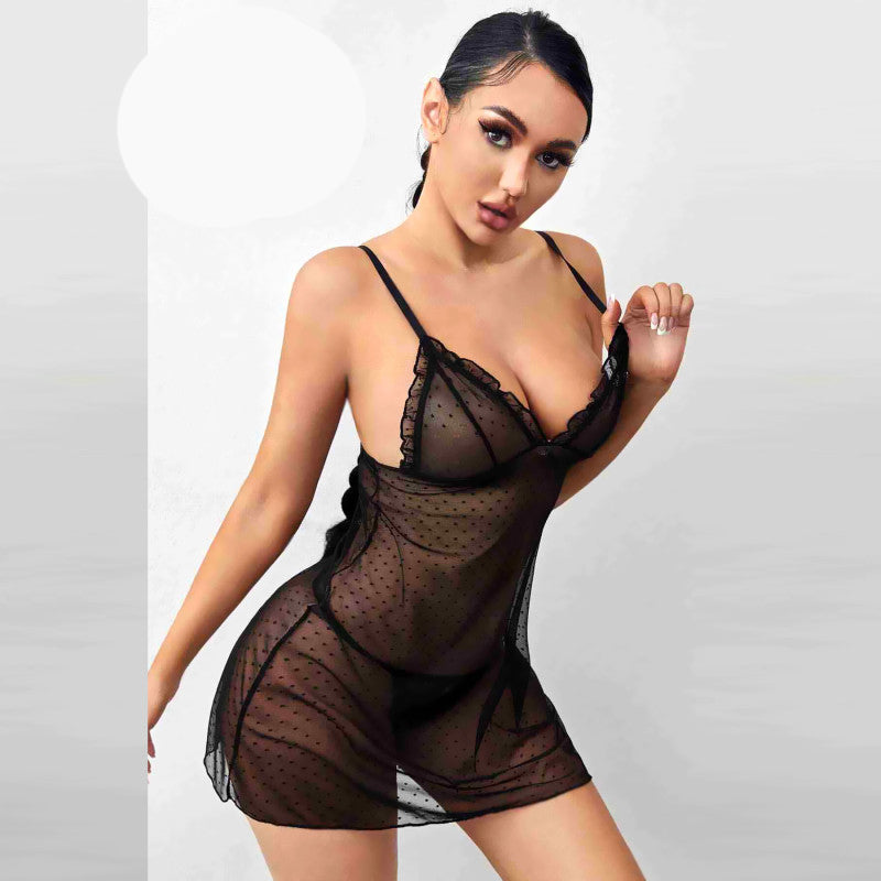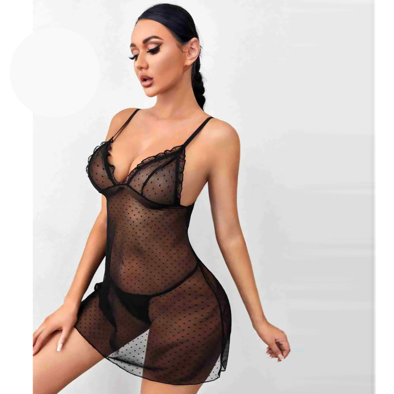 Черна бейбидол нощница от тюл с прашки MS-2201. Дамски комплект от babydoll нощница с прашки. Изработен от ефирен тюл, без банели и с регулируеми презрамки. Комплект от 2 части (нощница + прашки).