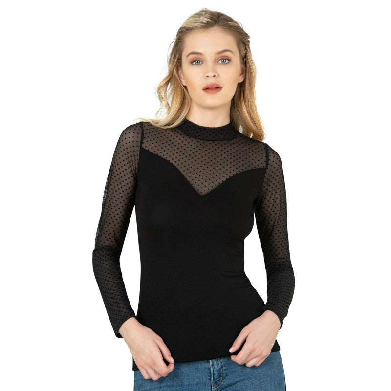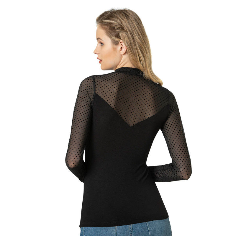 Черна блуза дълъг ръкав и деколте от тюл ON-26824. Мека, фина, еластична материя – вискоза. Полуполо яка от дантела. Еластичен модел.