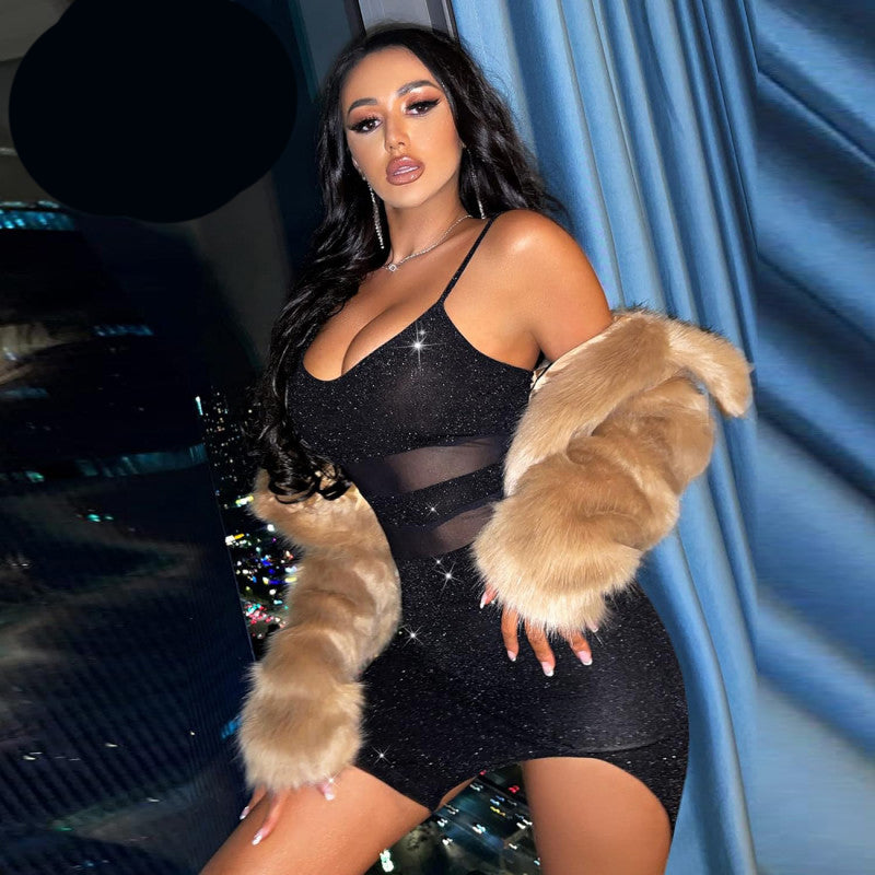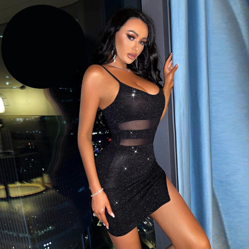 Черна клубна рокля с блестящ ефект PT-1102. Клубна черна мини рокля с блестящ ефект и странична цепка. Еластичен модел с регулируеми презрамки.
