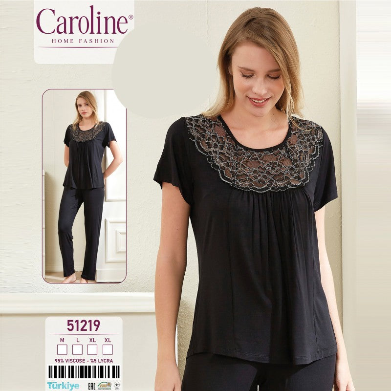 Черна пижама с къс ръкав и дълъг панталон 51219. Пижама / домашно облекло от вискоза. Комплект от дълъг панталон с блуза с къс ръкав и дантелено деколте. Еластичен модел.