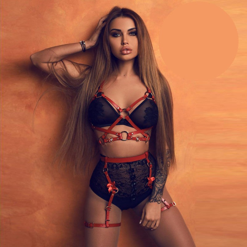 Червен кожен харнес комплект с жариери AA-700794