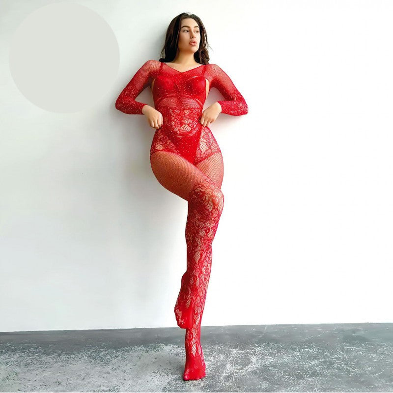 Червено мрежесто боди с камъчета и без дъно NL-5556. Секси еротично червено мрежесто боди с дълги ръкави, без закопчаване. Без размер – подходящо за XS, S, M и L.