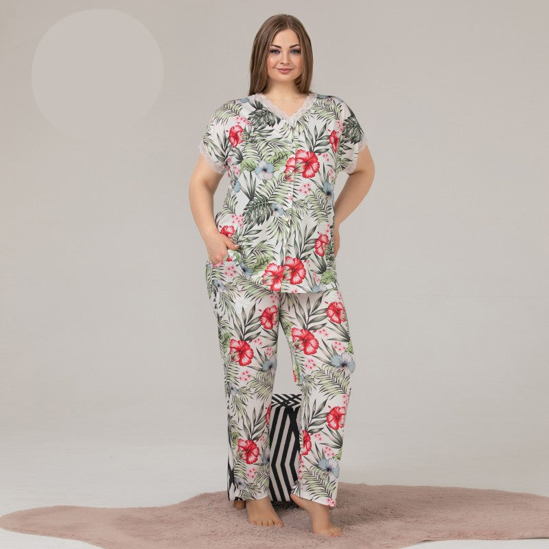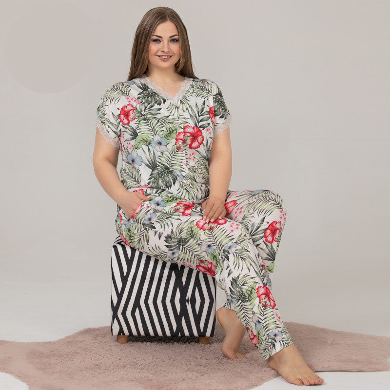 Дамска макси пижама от блуза и панталон LY-10884. Дамски комплект от вискоза. Мека, приятна за тялото материя. Блуза с къс ръкав и закопчаване с копчета. Дантела по раменете и деколтето. Дълъг панталон с джобове.