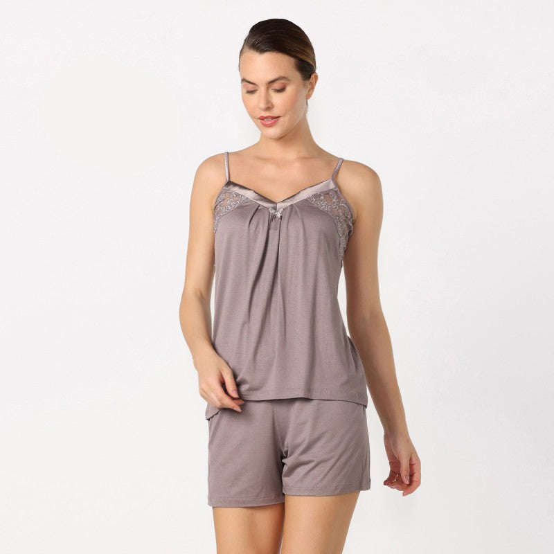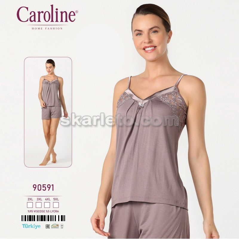 Дамска макси пижама от корсаж с шорти CE-90591. Фин MAXI комплект домашно облекло / пижама в 2 части. Мека, фина, еластична, приятна за тялото материя-вискоза. Съчетание на къси панталонки с ластичен колан и корсаж с тънки, регулируеми презрамки.