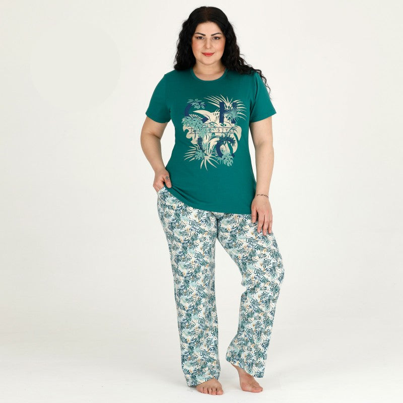 Дамска макси пижама от тениска с панталон B-3347. Комплект домашно облекло от две части – блуза с къс ръкав и дълъг панталон с джобове.