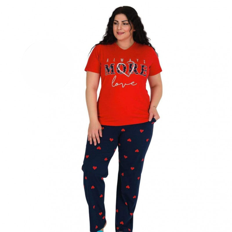 Дамска макси пижама с тениска и панталон B-3338. Комплект домашно облекло от две части – блуза с къс ръкав и дълъг панталон с джобове.