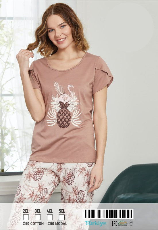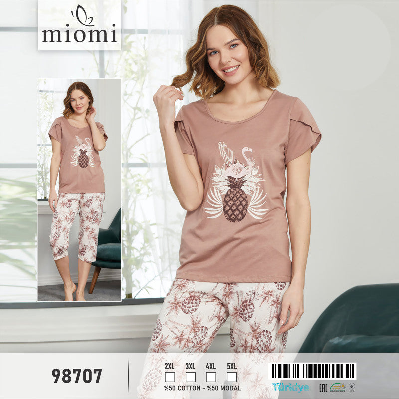 Дамска памучна пижама с къс ръкав и бермуди 98707. Комплект от модал и памук – мека и фина , приятна за тялото материя. Тениска с къс ръкав и 7/8 бермуди.