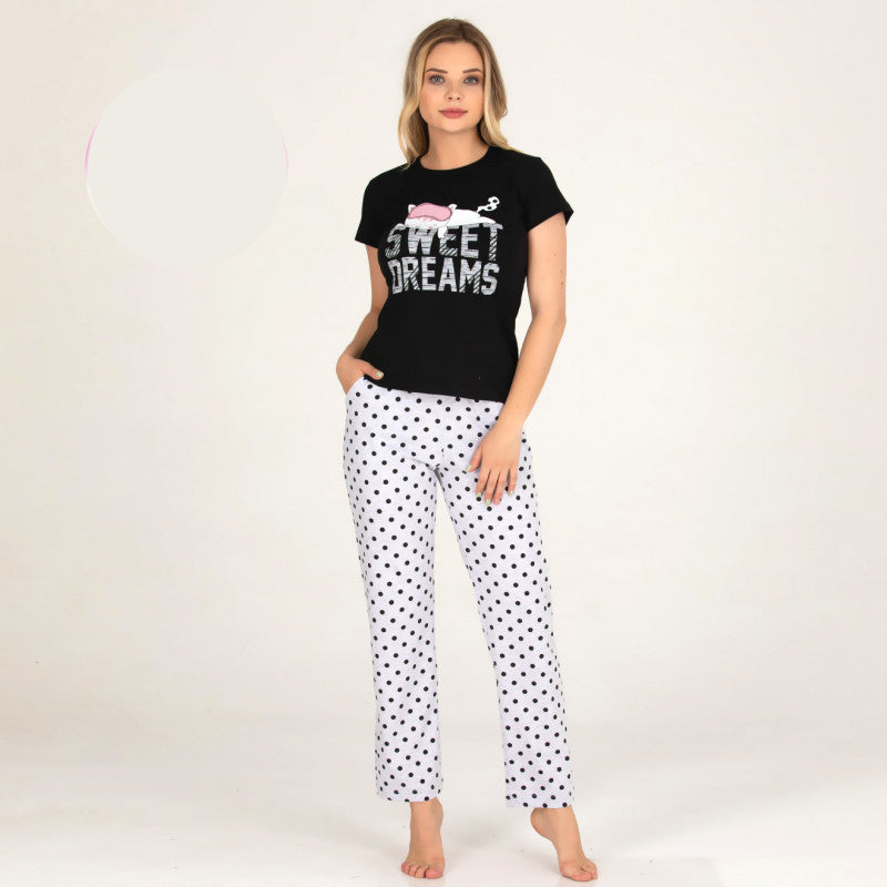 Дамска пижама от тениска с панталон B-3255. Комплект от две части – блуза с къс ръкав и дълъг панталон с джобове.