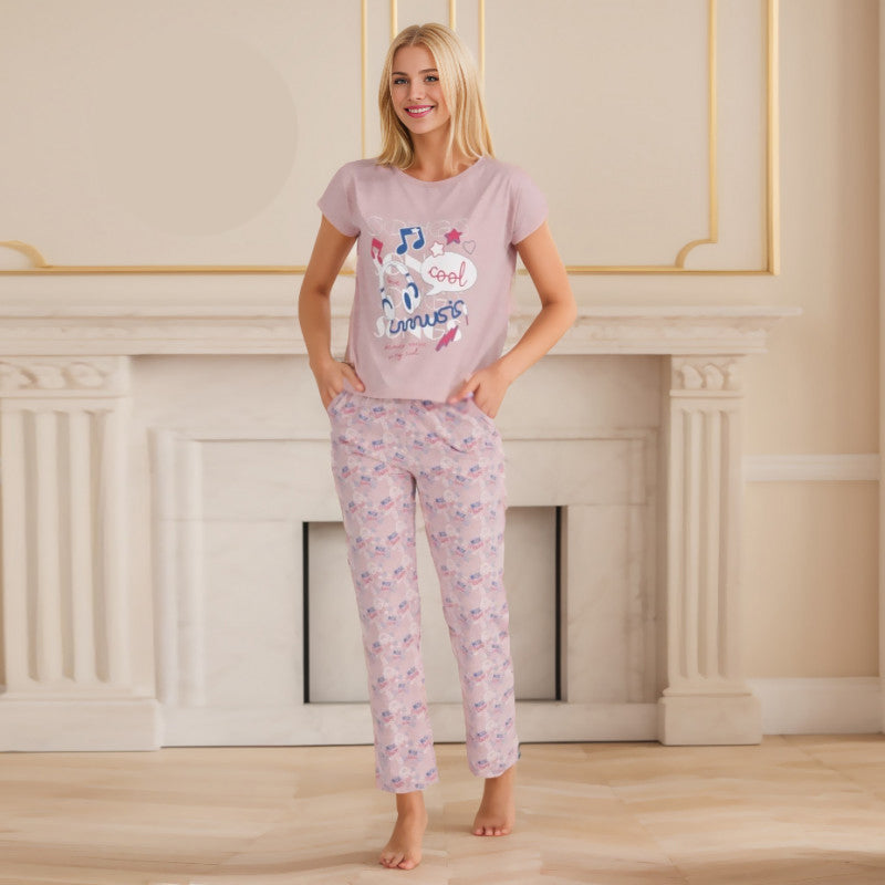 Дамска пижама от тениска с панталон B-3326. Комплект от две части – блуза с къс ръкав и дълъг панталон с джобове.