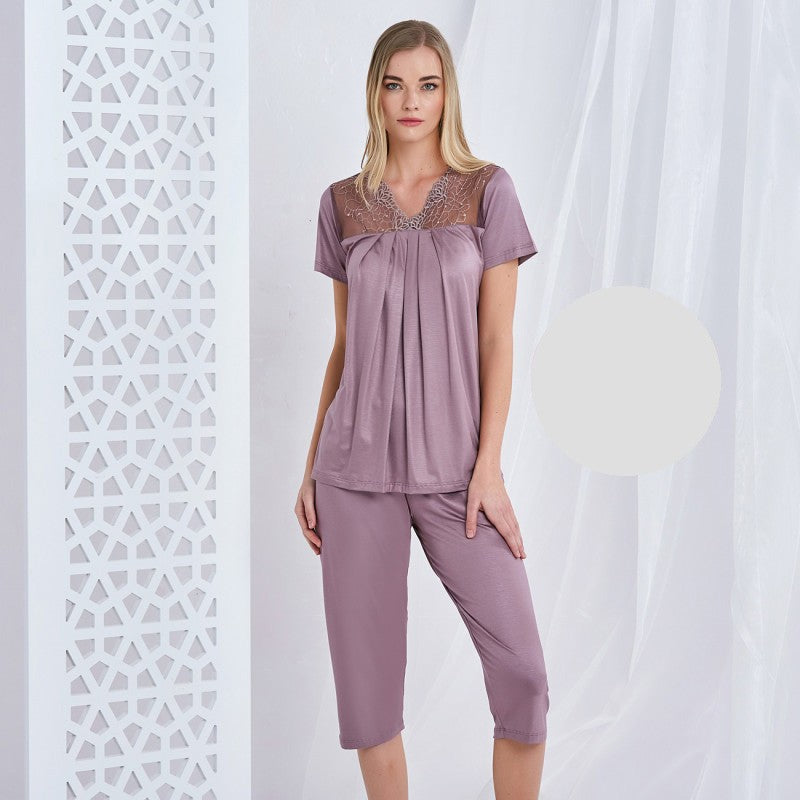 Дамска пижама от туника и 7/8 панталон CA-96052. Мека, фина, еластична, приятна за тялото материя – вискоза. Домашно облекло в 2 части с туника и 7/8 бермуди. Платка от нежа и фина бродирана дантела. Набор на бюста за допълнителна ширина. 7/8 бермуди с ластичен колан.