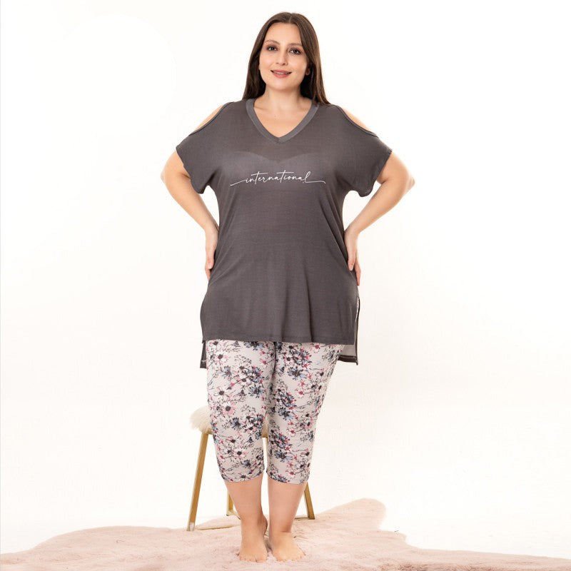 Дамска пижама от туника с клин LY-10705. Комплект туника с къси открити ръкави и клин е идеалният избор за дамите, търсещи комбинация от удобство и стил.