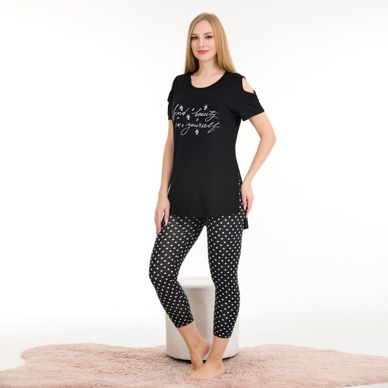 Представяме ви комплект домашно облекло от вискоза , който съчетава елегантност и удобство в един уникален дизайнерски аспект. Този комплект включва практична туника и удобен клин със 7/8 дължина, които ще ви накарат да се чувствате неповторимо у дома.