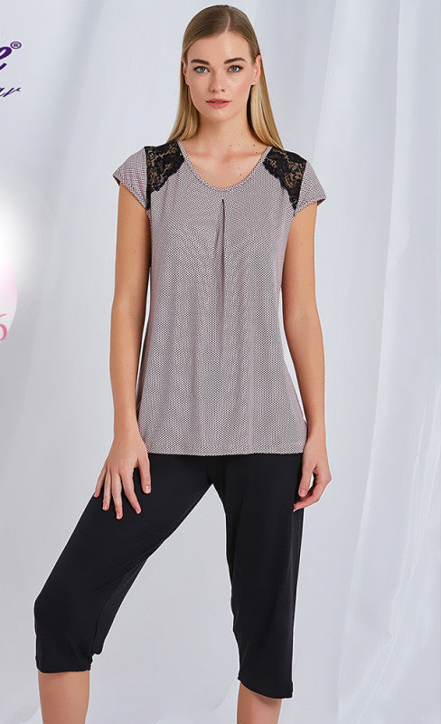 Дамска пижама с къс ръкав и 7/8 панталон в голяма номерация 98056. Горна част тип тениска с къс ръкав. Долнище със 7/8 черен панталон.