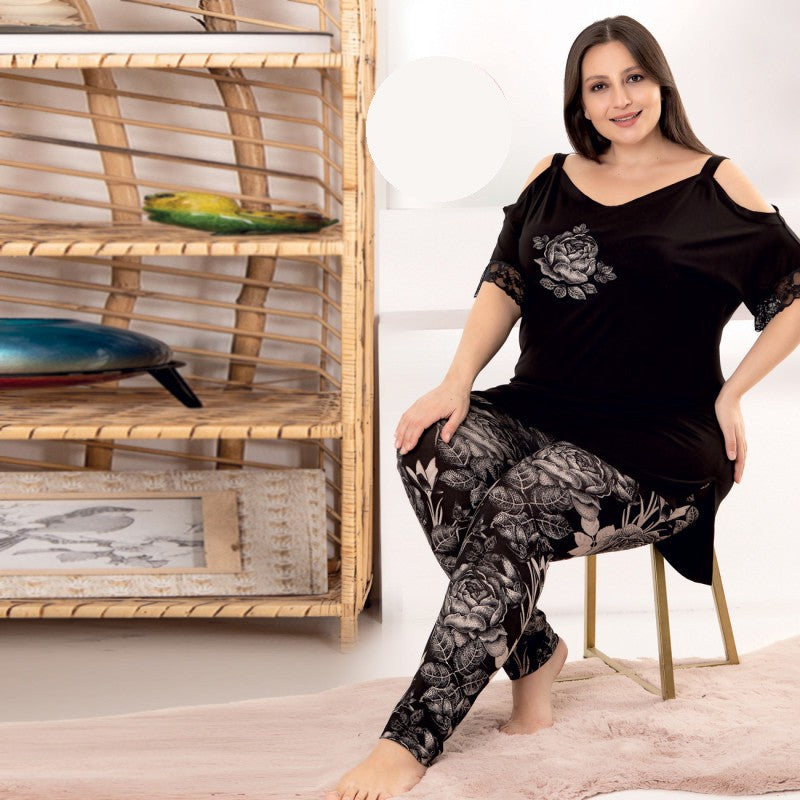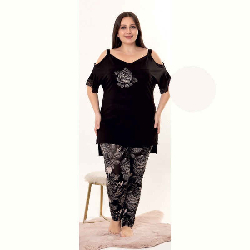 Търсите ли идеалното домашно облекло, което съчетава стил и комфорт? Представяме Ви нашия комплект от две части, включващ блуза с къс ръкав и голо рамо, както и дълъг панталон с ластик. Създаден с внимание към детайла, този комплект е направен от високо качество 95% Вискоза и 5% Еластан, което осигурява оптимална еластичност и удобство през целия ден.