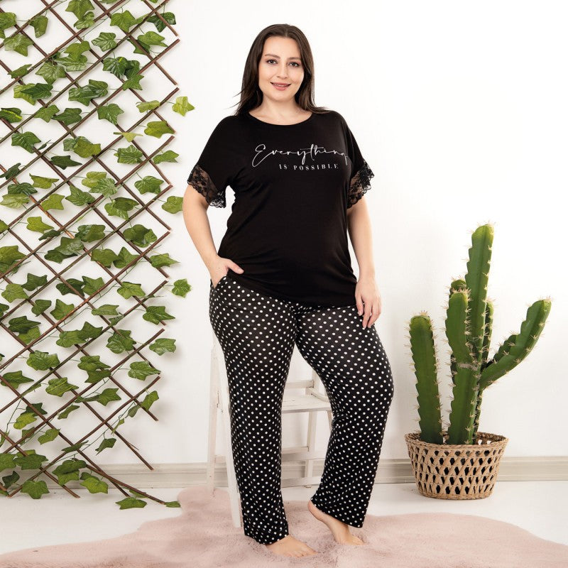 Погрижете се за себе си с нашия уникален комплект пижама / домашно облекло от, проектиран с усет към удобствотo и стилa! Комплектът е изработен от висококачествена материя (95% вискоза + 5% еластан), предлагаща меко и приятно на допир усещане върху кожата. С размери от XXL до XXXXL, той е перфектен даже за най-взискателните жени.