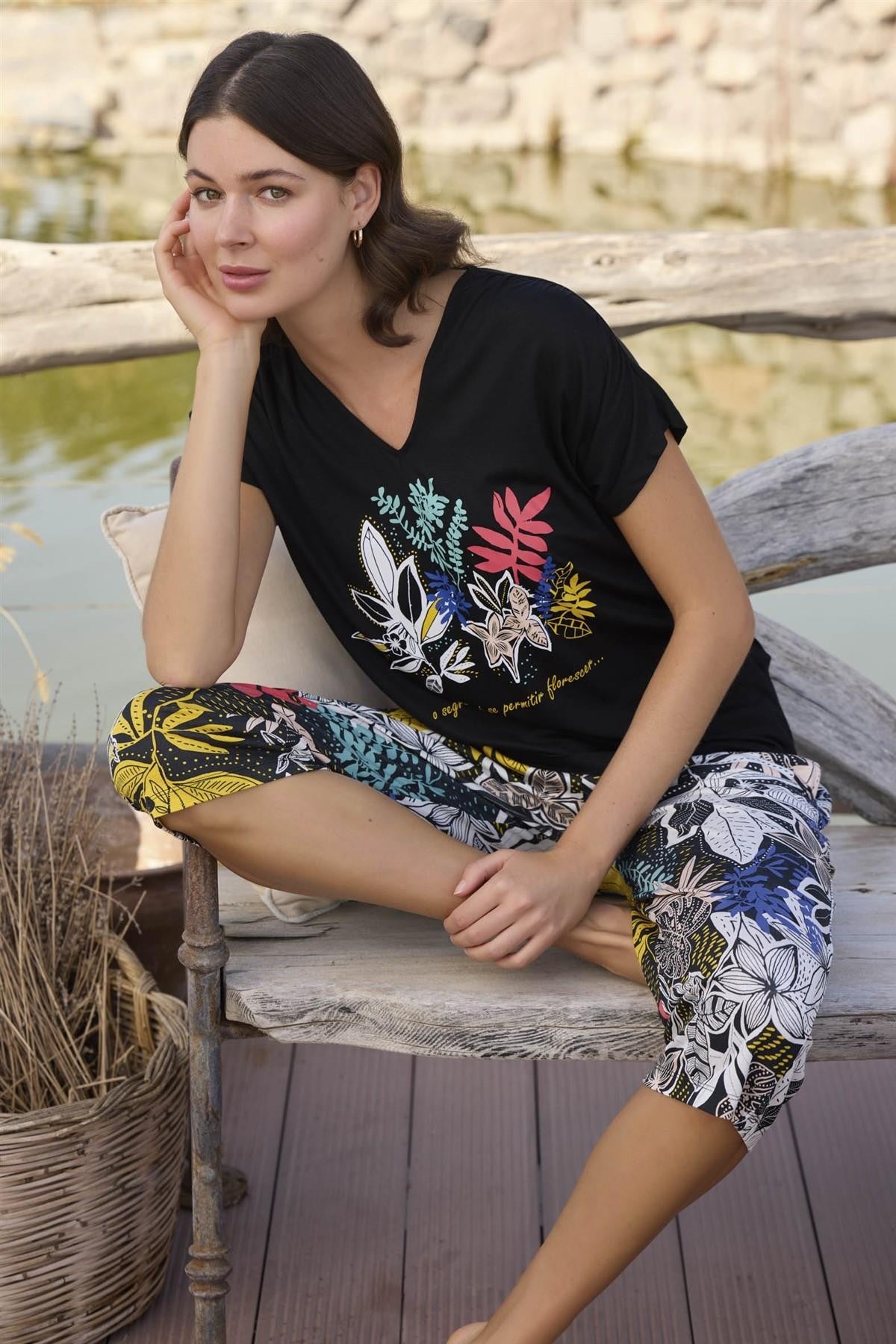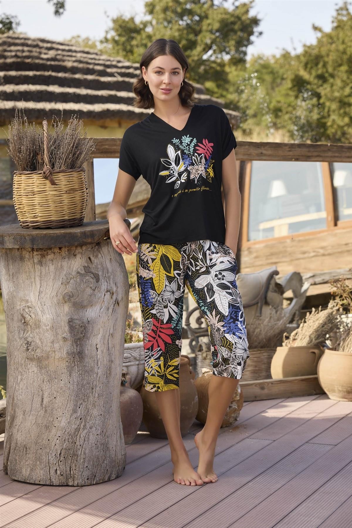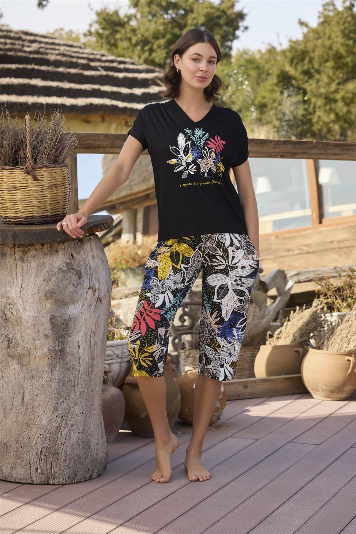 Дамска пижама с къс ръкав от вискоза 24100. Блуза с къс ръкав и флорален принт отпред. Долнище до коляното с ластик на талията.