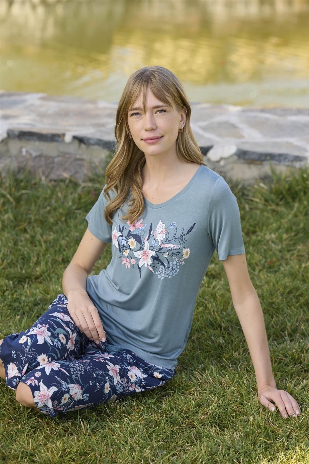 Дамска пижама с къс ръкав от вискоза 24104. Блуза с къс ръкав и флорален принт отпред. Долнище до коляното с ластик на талията.