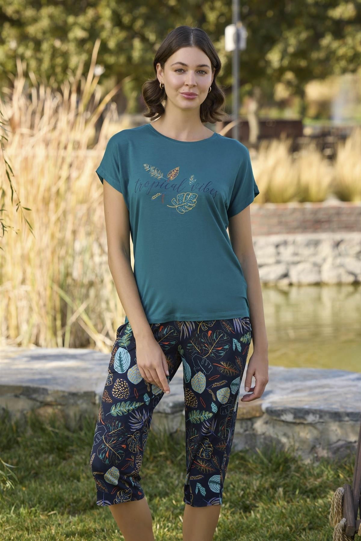 Дамска пижама с къс ръкав от вискоза 24107. Блуза с къс ръкав и цветя отпред. Долнище до коляното с ластик на талията.