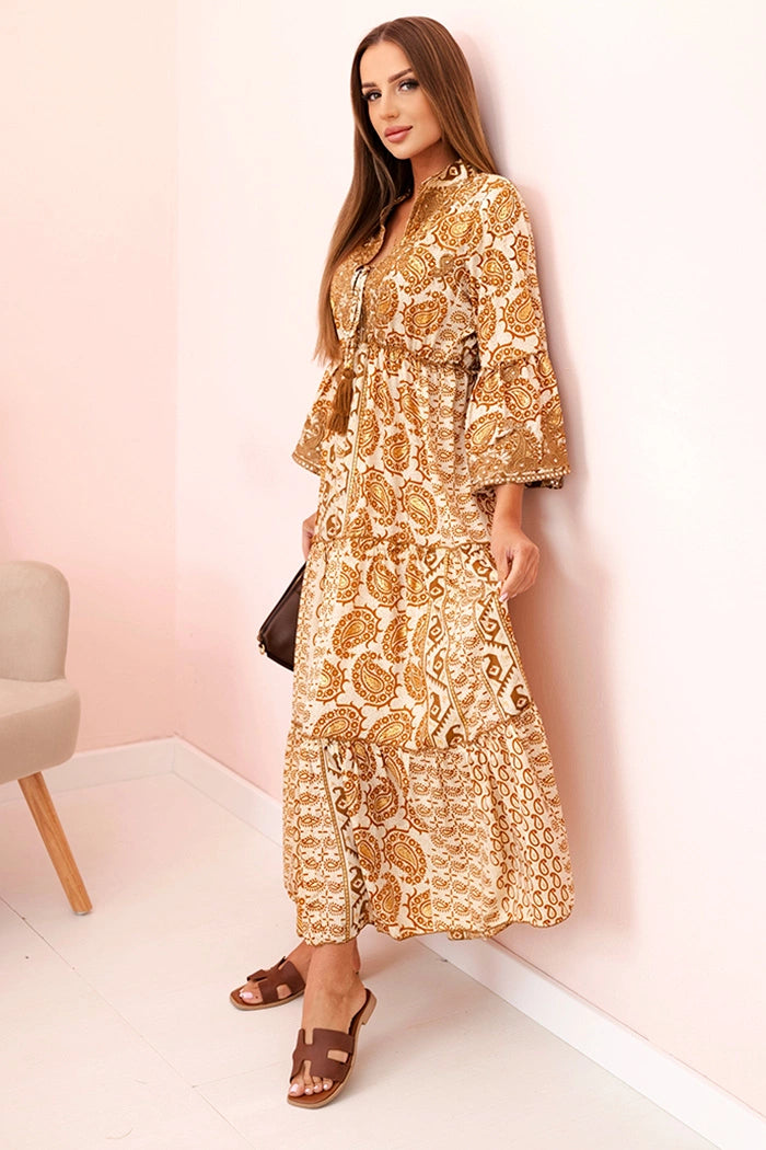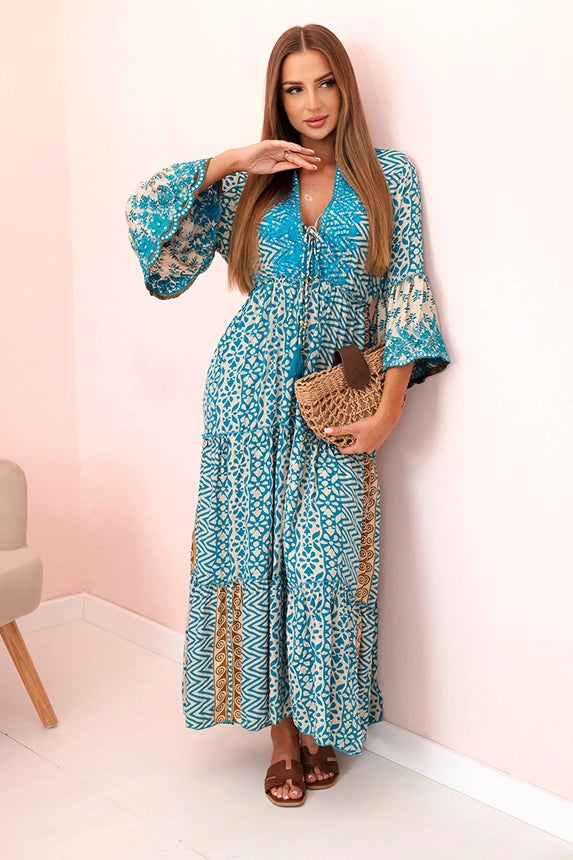 Тази уникална дамска макси рокля е изработена от лека и дишаща вискоза, която се драпира красиво по фигурата. Моделът е с етно десен в контрастни нюанси и женствена кройка с корекция на талията, която подчертава силуета. Дългите ръкави и V-образното деколте придават лекота, а макси дължината го прави идеален за ежедневно носене, празник, разходка или събиране с приятели.