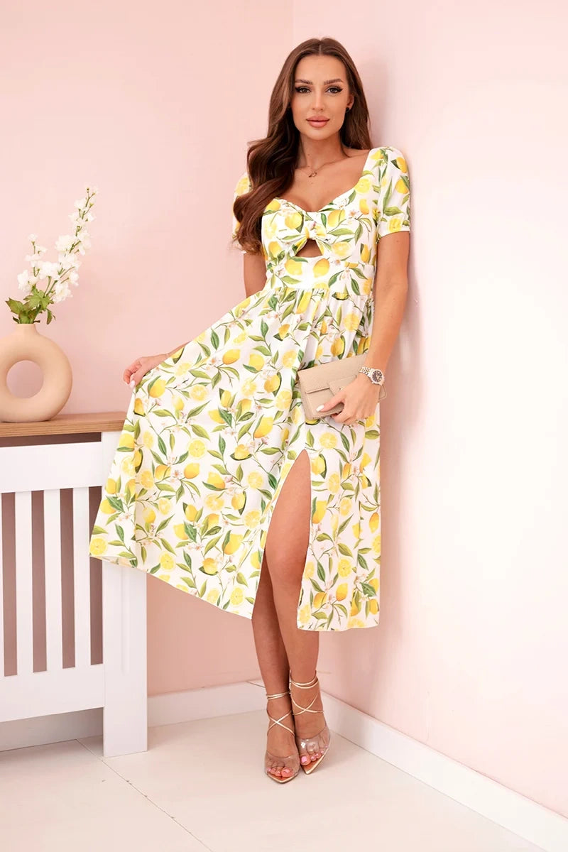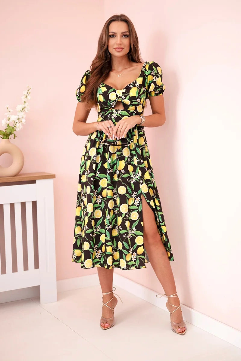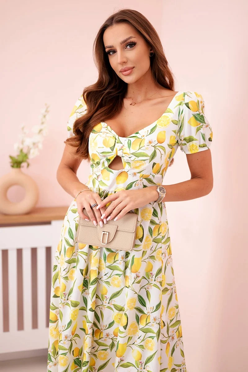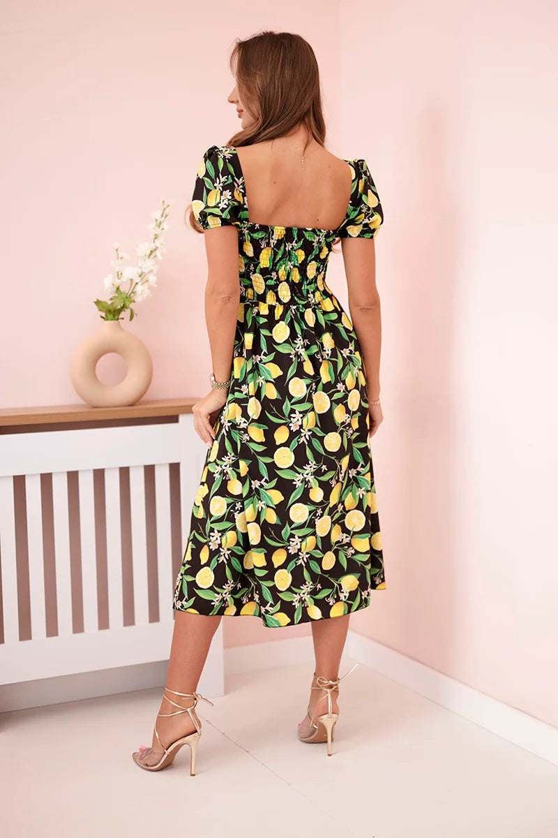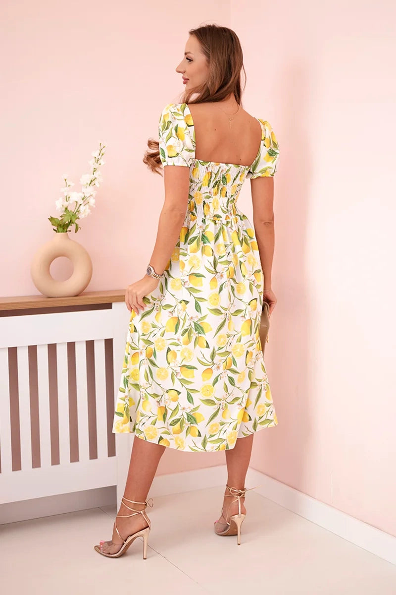 Търсите перфектната рокля за топлите дни? Тази лека, ефирна дамска рокля с издути ръкави и блузи е отличен избор! Летният десен му придава свежест и неповторим характер, а еластичното горнище се адаптира красиво към фигурата. Роклята се отличава с фино деколте и леко разширена долна част, осигуряваща свобода на движение и удобно носене. Перфектен за летни разходки, ваканции или събирания на открито. Размерът е универсален и подходящ за жени с размери S, M или L.