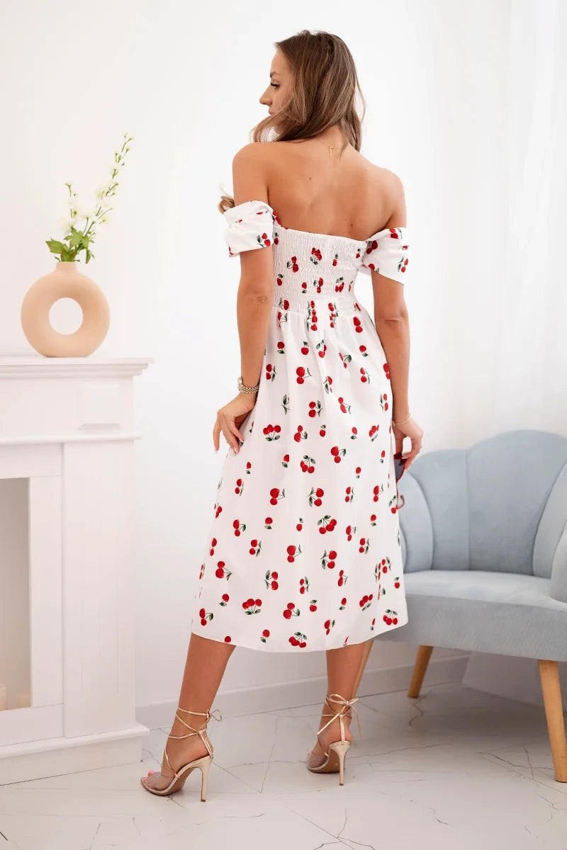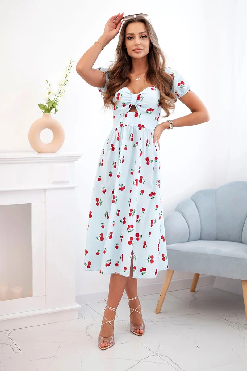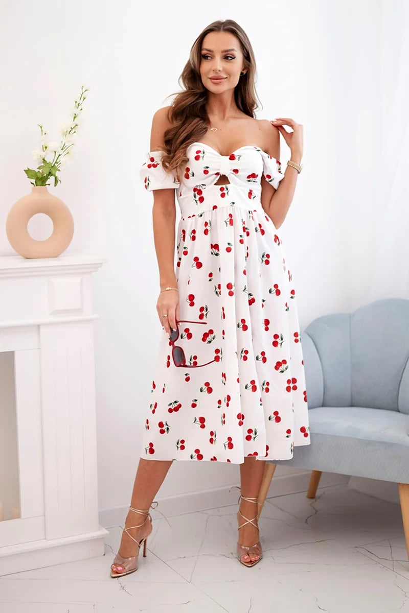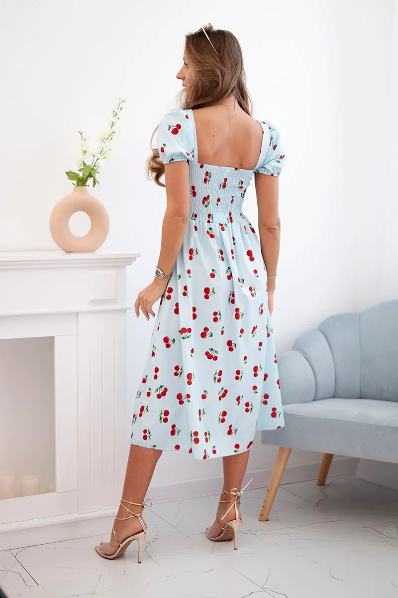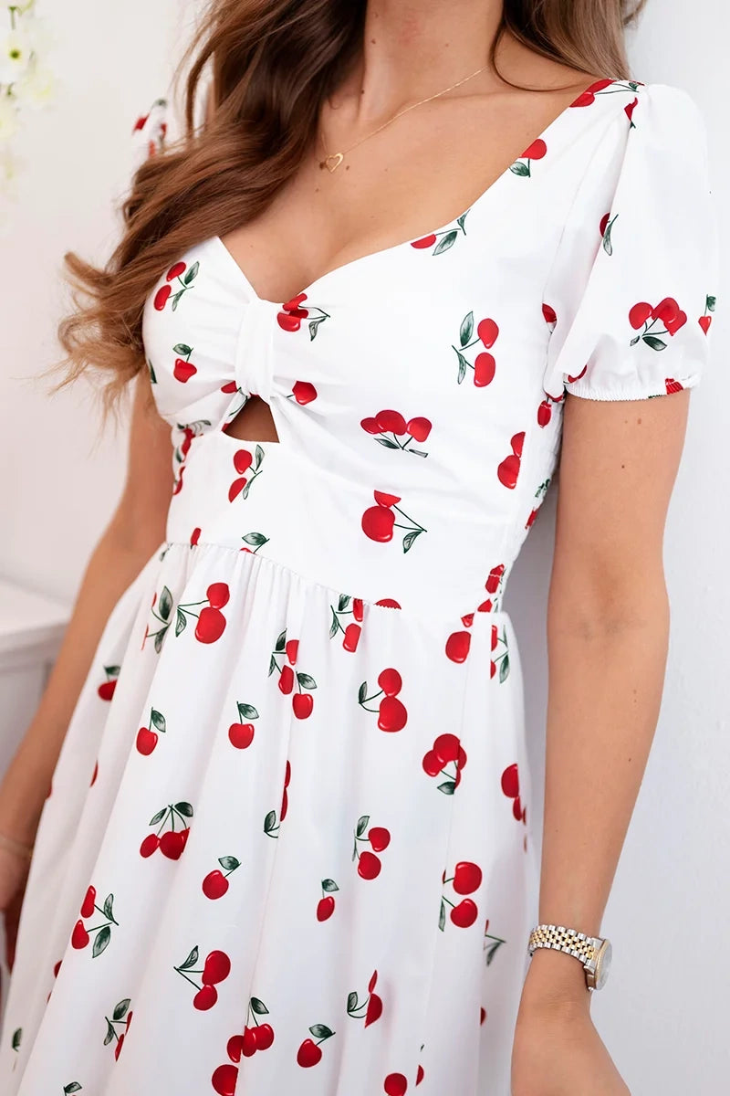 Търсите перфектната лятна рокля? Тази очарователна дамска рокля с издути ръкави и женствено деколте е перфектен избор! Изработена от лека, дишаща материя, осигурява комфорт през целия ден. Романтичният десен на червена череша придава момичешки чар, а вталената кройка подчертава силуета. Той е идеален за ежедневни излети, летни срещи или ваканционни разходки. Размерът е универсален и става за жени с размер S, M или L.