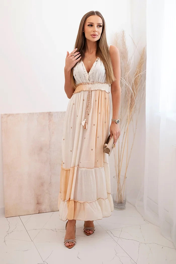 Търсите перфектната рокля за лятото, празниците или фестивалите? Тази дамска макси рокля с презрамки е перфектният избор за жени, които ценят комфорта и уникалния стил. Изработена от 100% лека и дишаща вискоза, тя гарантира комфорт дори и в най-горещите дни. Модерният етнически модел и ярките цветове определено ще ви накарат да се откроите от тълпата. Горната част на роклята е с еластична лента, която красиво се приспособява към формата на тялото. Този модел е идеален за плаж, разходки и летни събирания с приятели. Размерът е универсален и е подходящ за дами, носещи S, M или L.