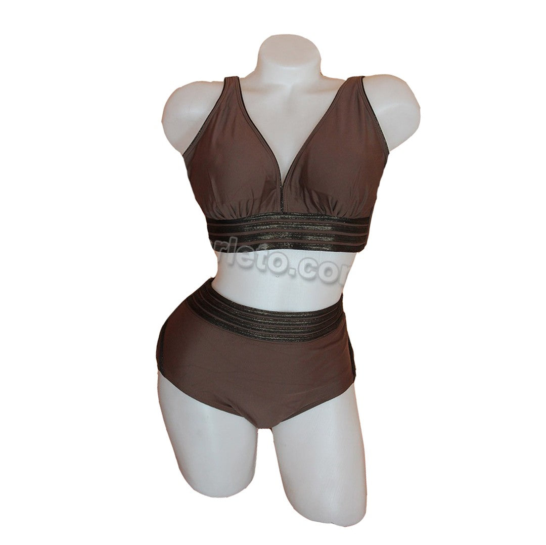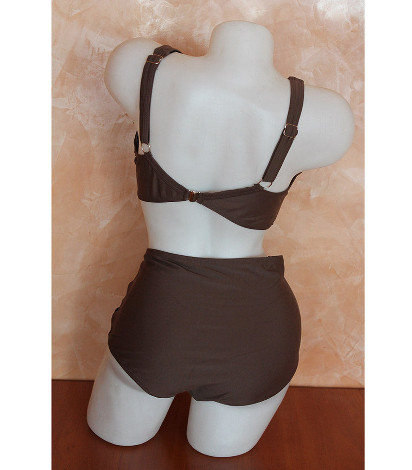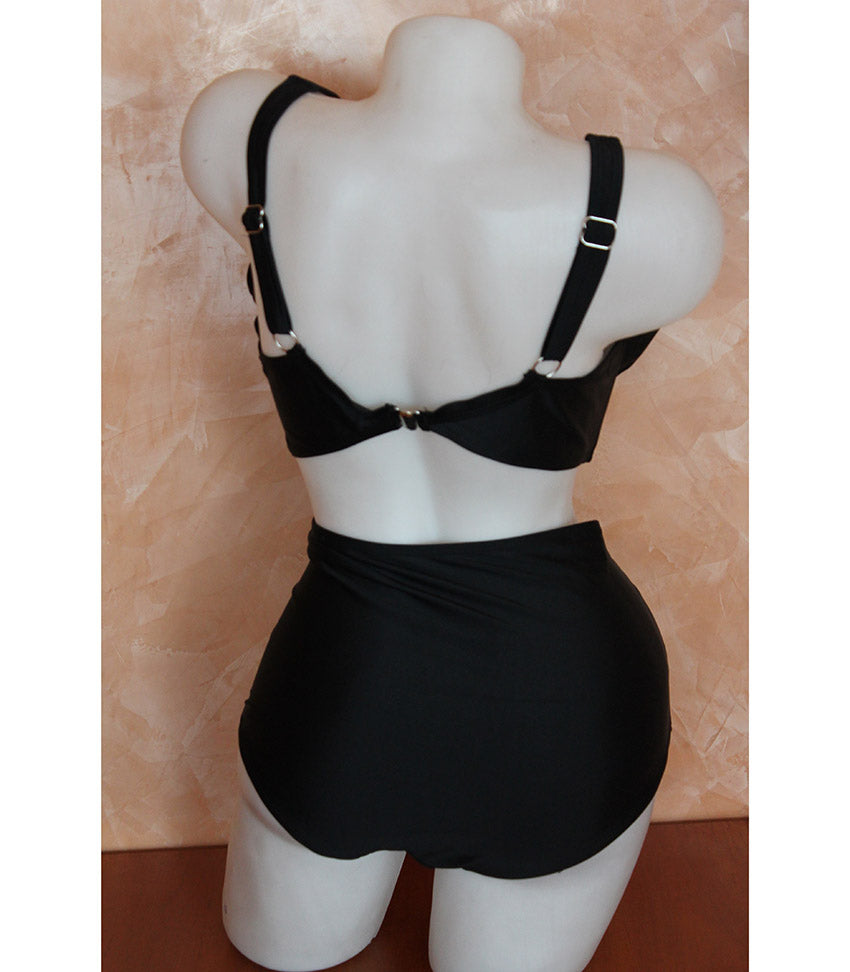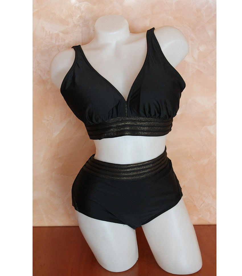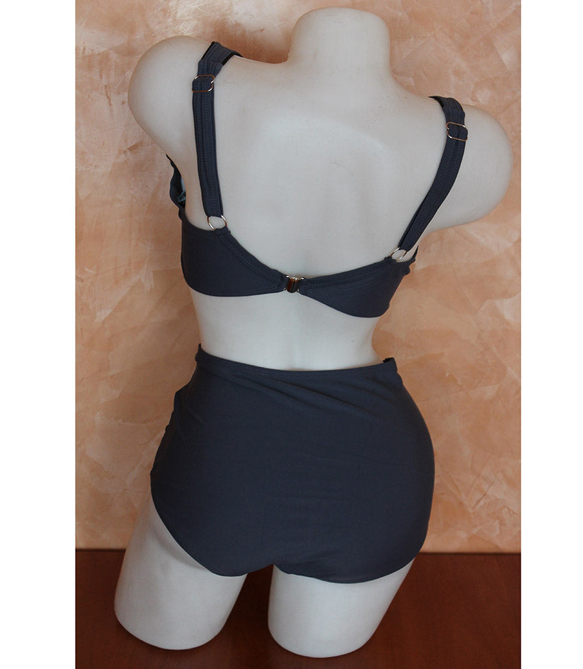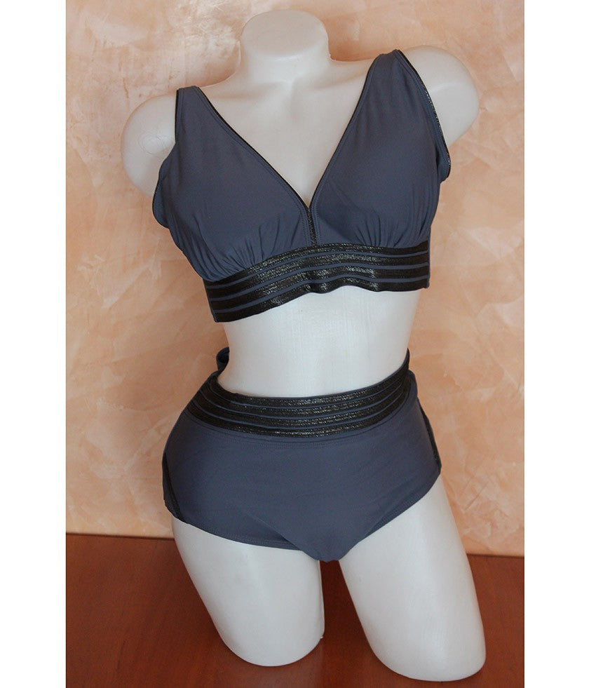 Дамски бански от две части 85994. Дълбоко горнище подходящо и за по големи бюстове. Мека чаша с лека подложка, която може да се маха. Широк ластик в основата придържа бюста чудесно. Долнище с висока талия и широк ластик.