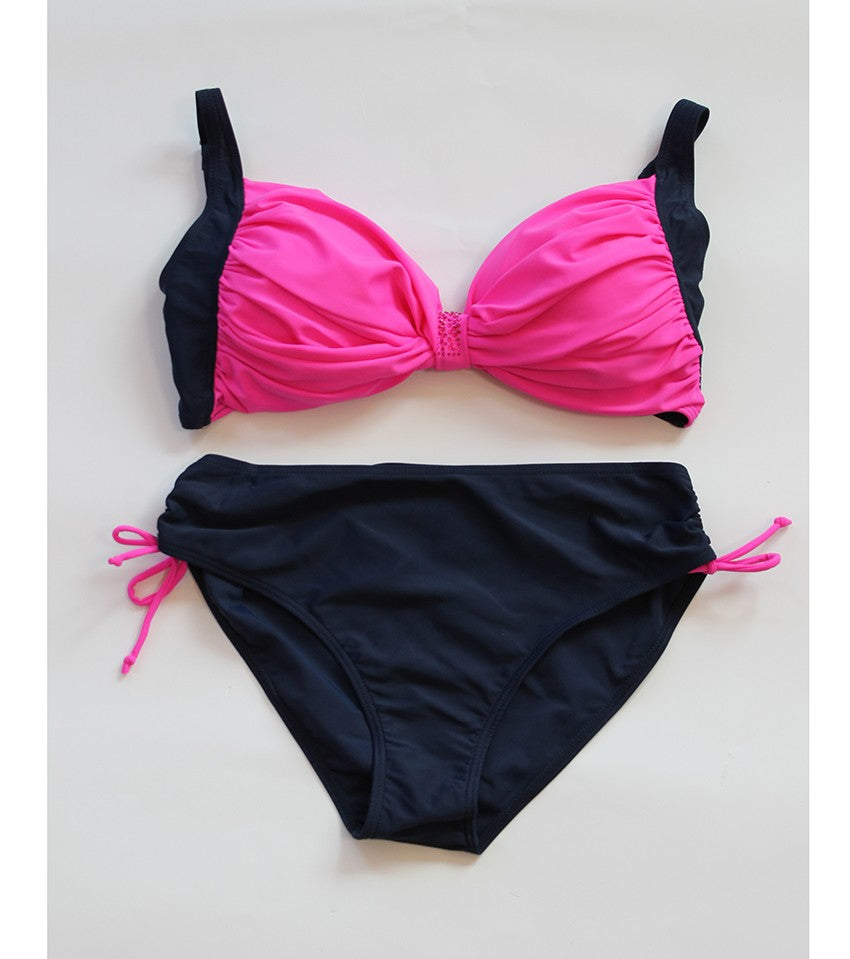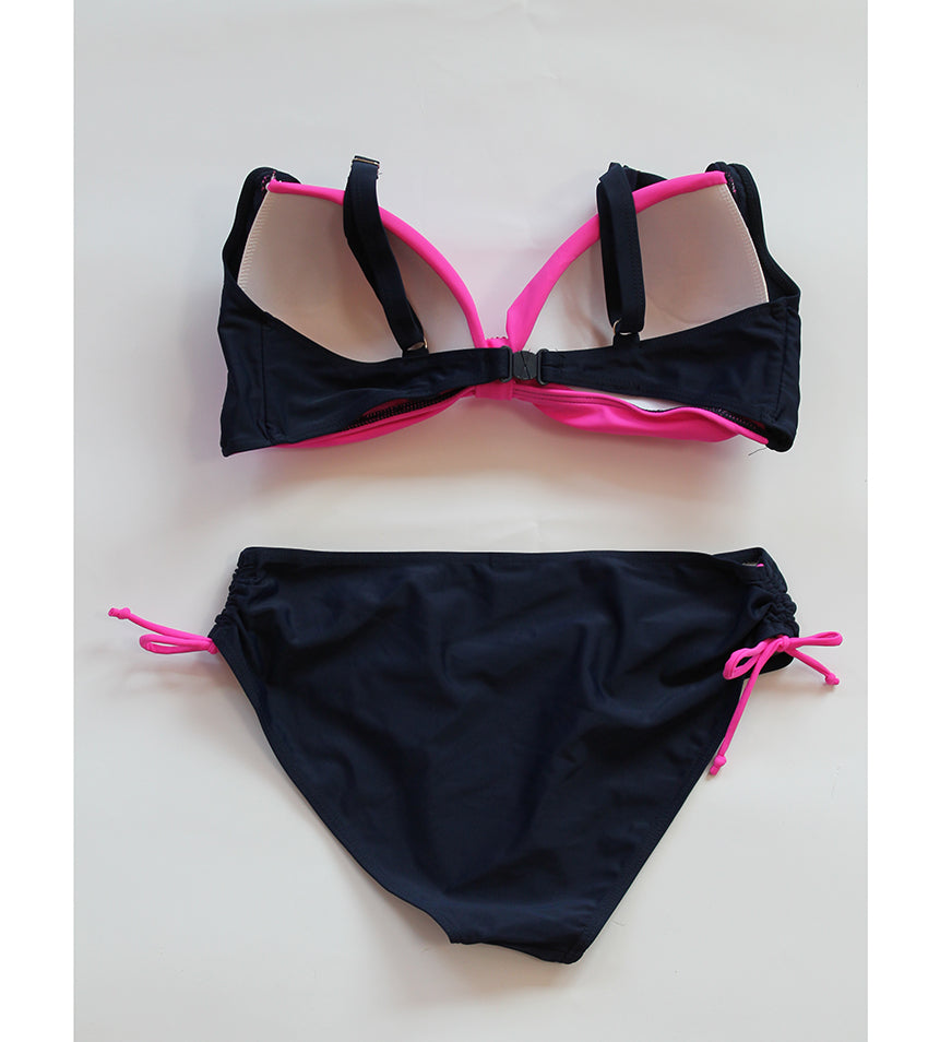 Дамски бански с оформена чаша без банели Биляна. Горна част в цикламен цвят с оформени чаши без банели. Дълбоко тъмно синьо долнище.