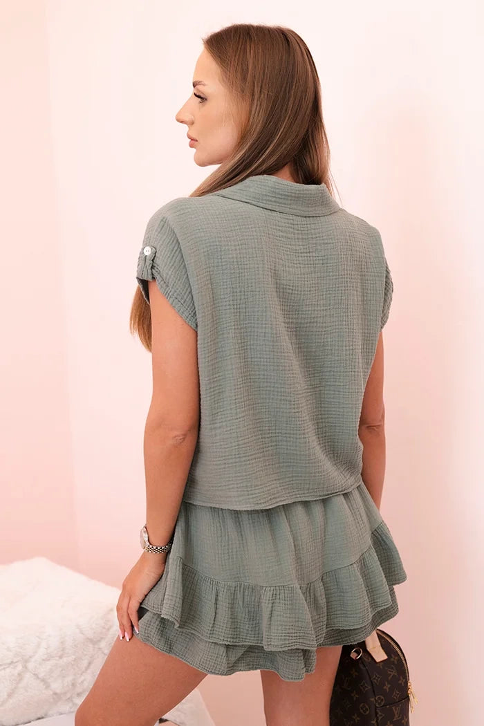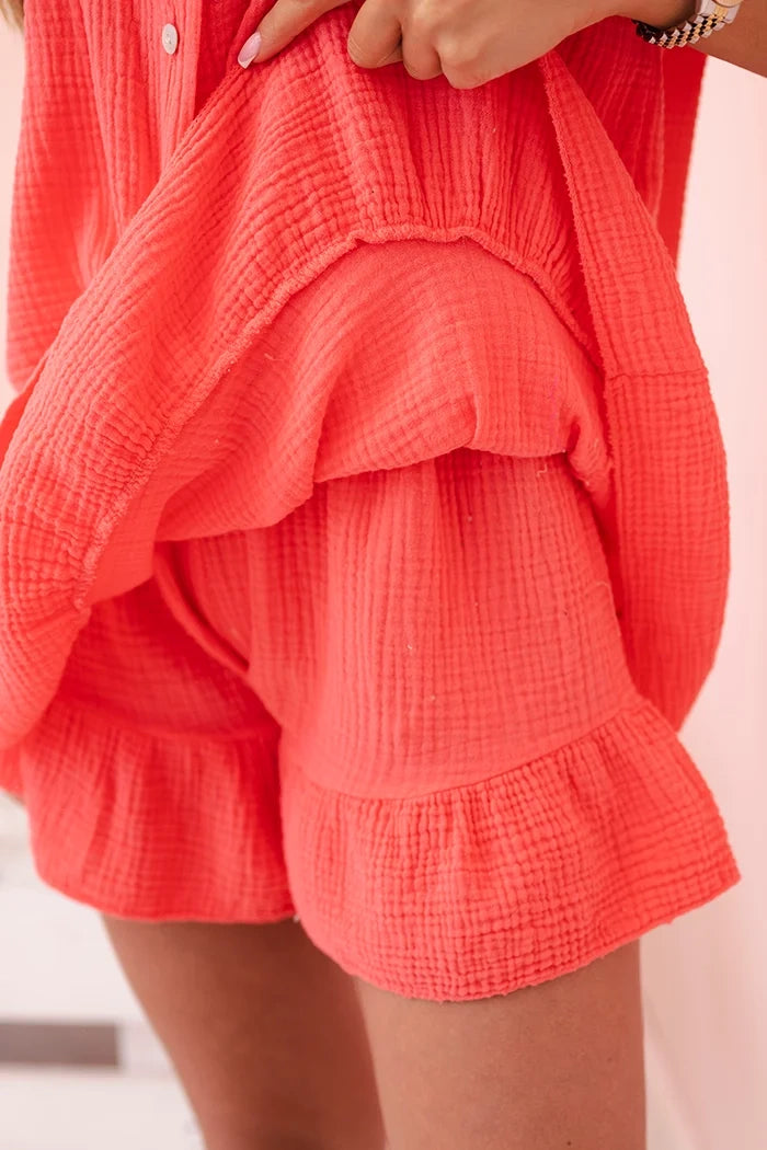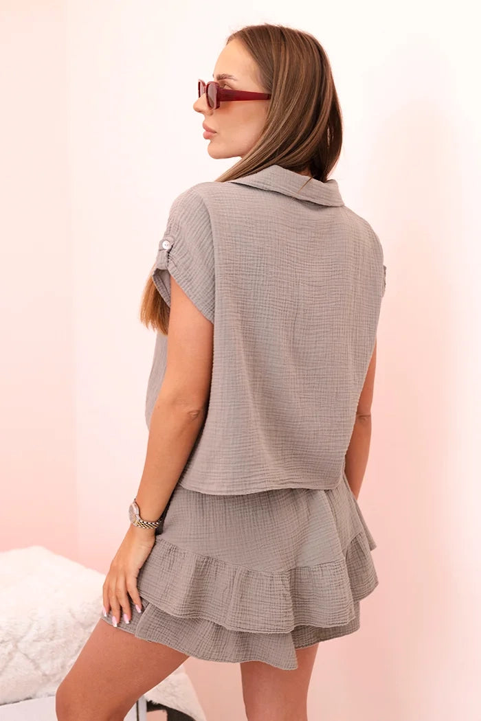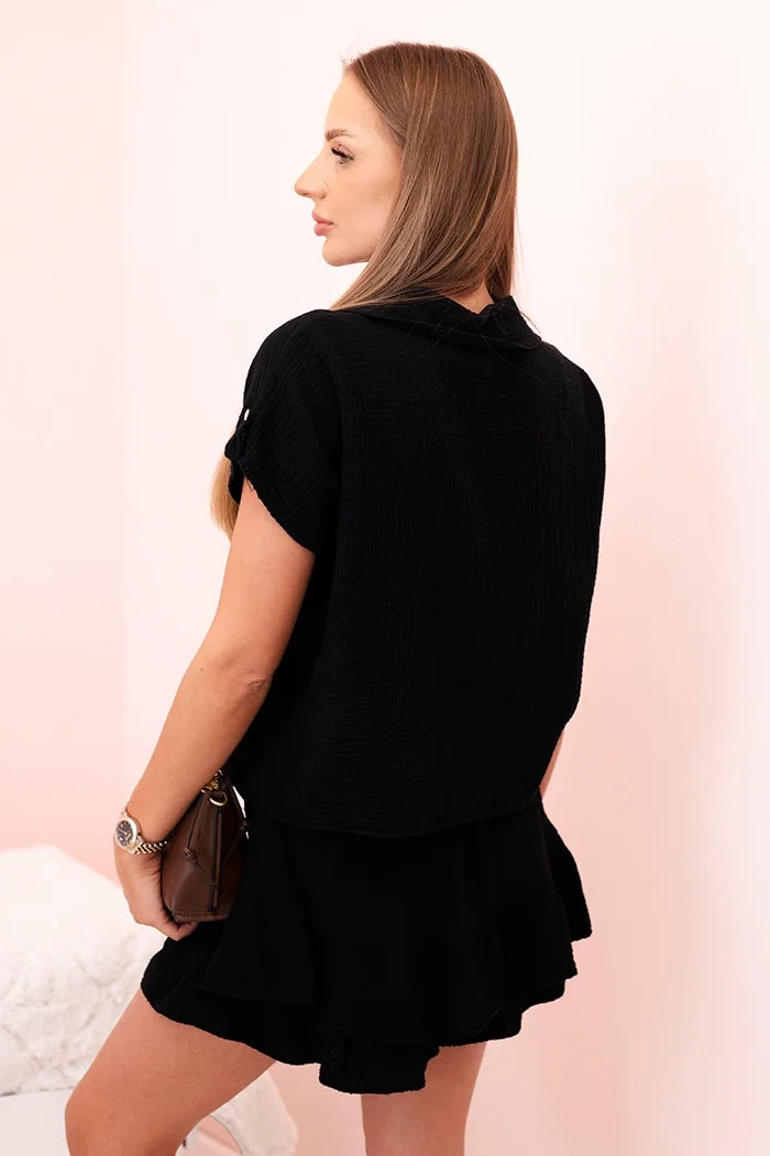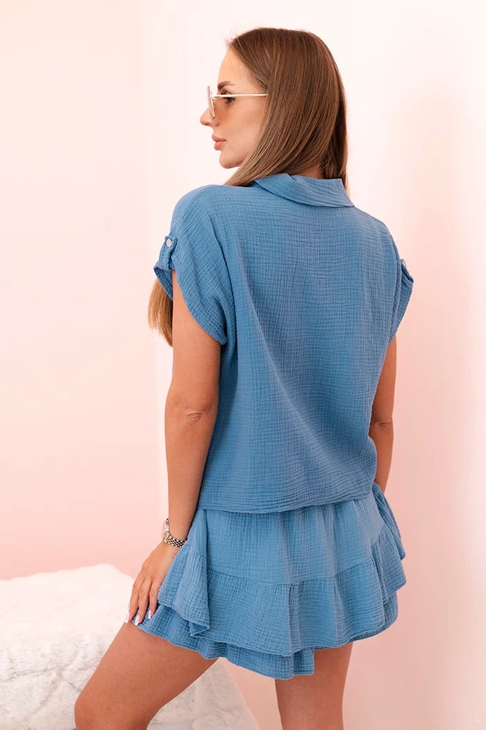 Този уникален дамски комплект от лек, дишащ муселин памук е задължителен за топлите дни. Ризата с къс ръкав и връзка в долната част добавя небрежна, стилна нотка, а късите пола с декоративен волан съчетават женствен чар със свобода на движение. Идеален комплект за почивка, летни разходки, срещи с приятели или уикенд пътувания. Естествената материя осигурява висок комфорт при носене, а вечната кройка прави комплекта подходящ за много поводи – както за ежедневието, така и за по-стилизирани варианти. Ако търсите комбинация от комфорт, стил и женственост – този комплект е хит. Размерът е универсален и става за жени с размери S, M или L.