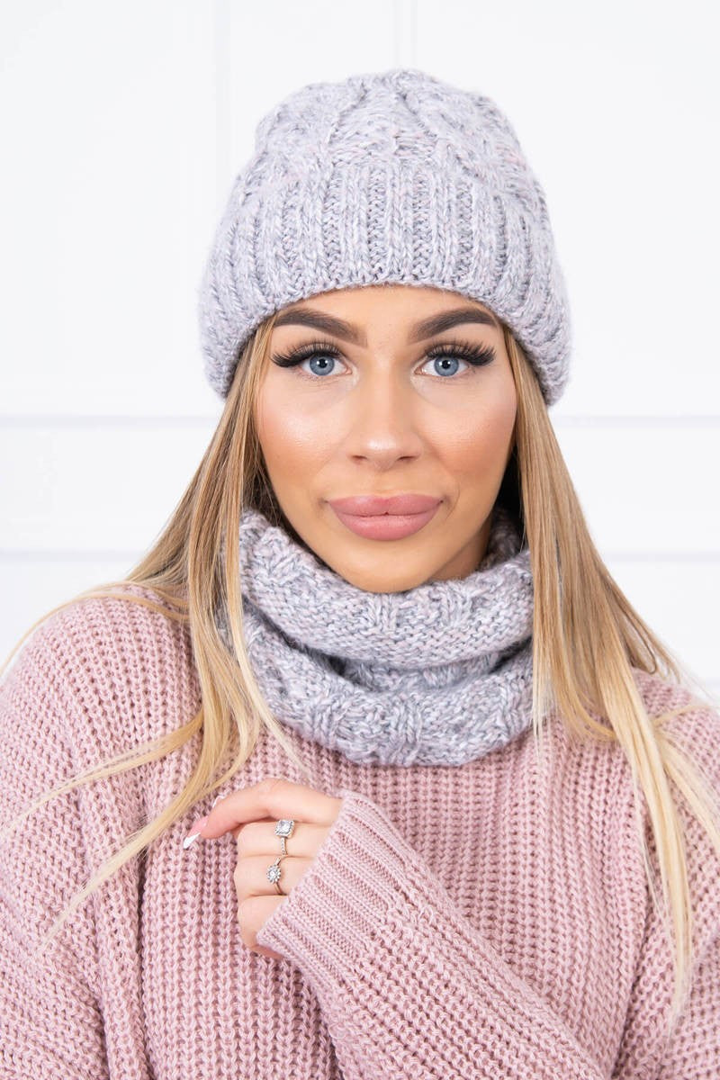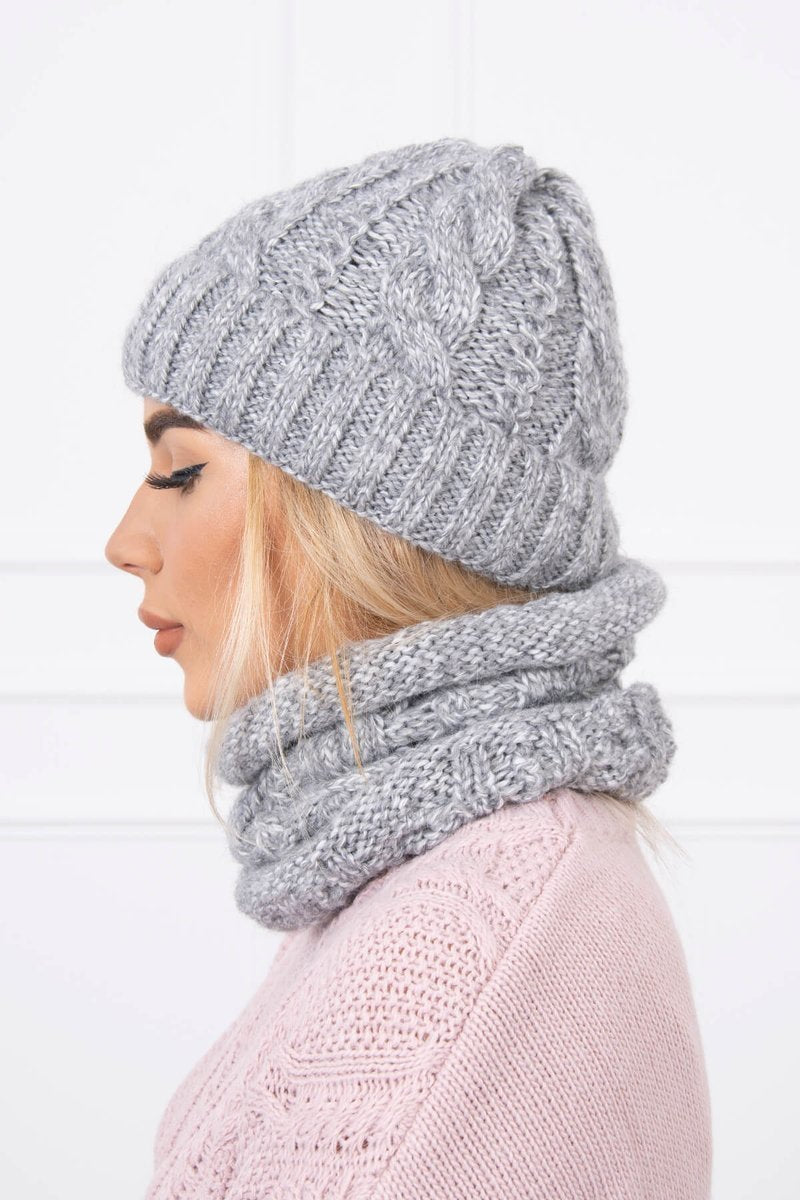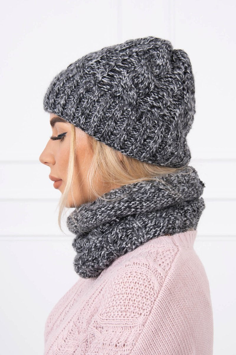 Предлагаме ви топъл комплект, състоящ се от шапка и коминче. Комплектът се отличава с атрактивен външен вид и солидна изработка. Много красив десен ще направи комплекта модерен и практичен аксесоар за много сезони. Размерът на капачката и комина е универсален.