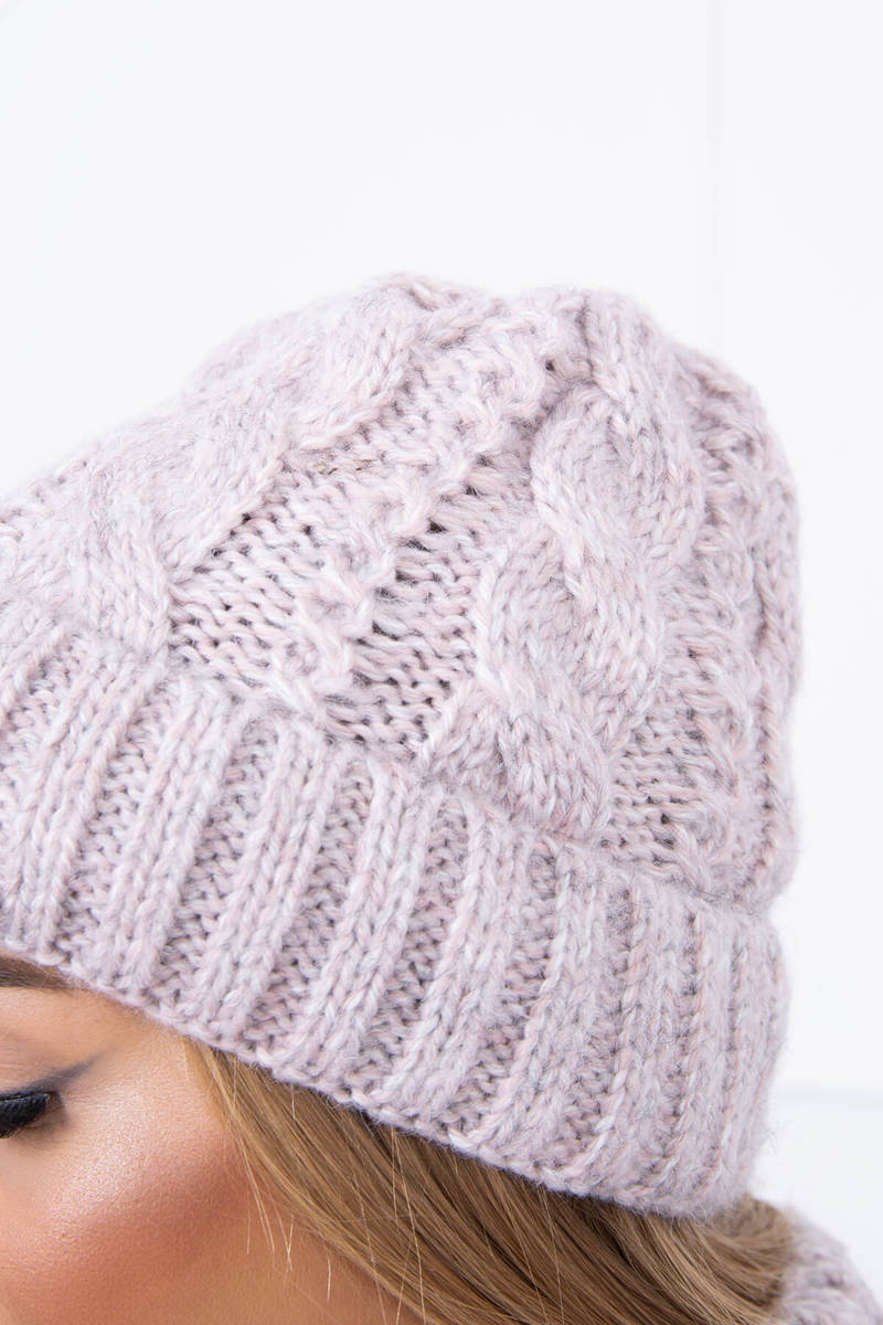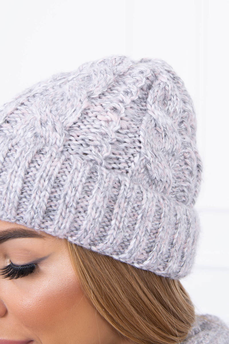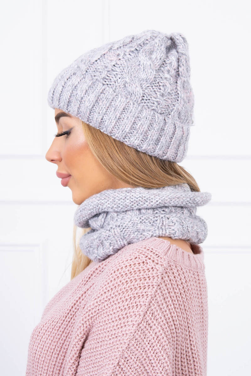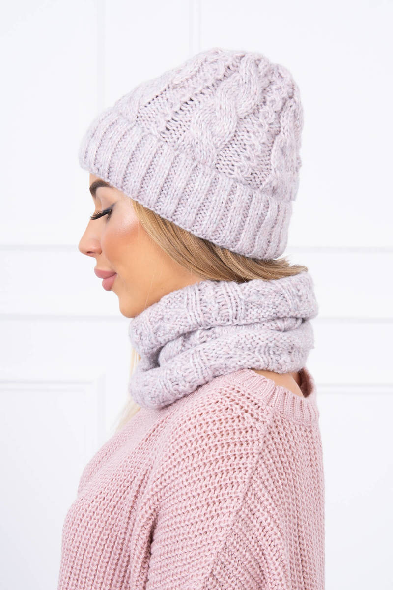 Предлагаме ви топъл комплект, състоящ се от шапка и коминче. Комплектът се отличава с атрактивен външен вид и солидна изработка. Много красив десен ще направи комплекта модерен и практичен аксесоар за много сезони. Размерът на капачката и комина е универсален.