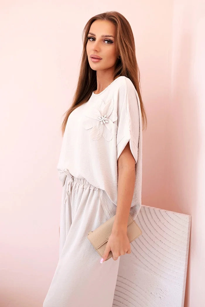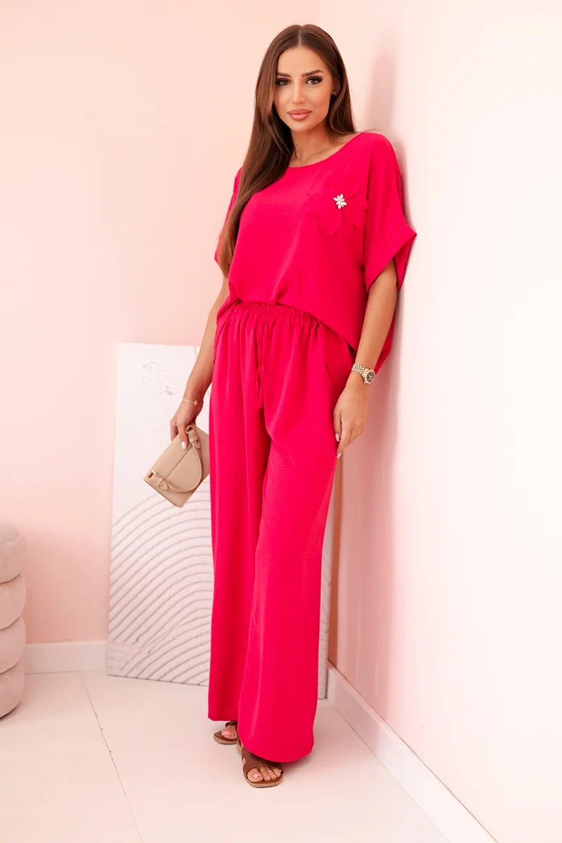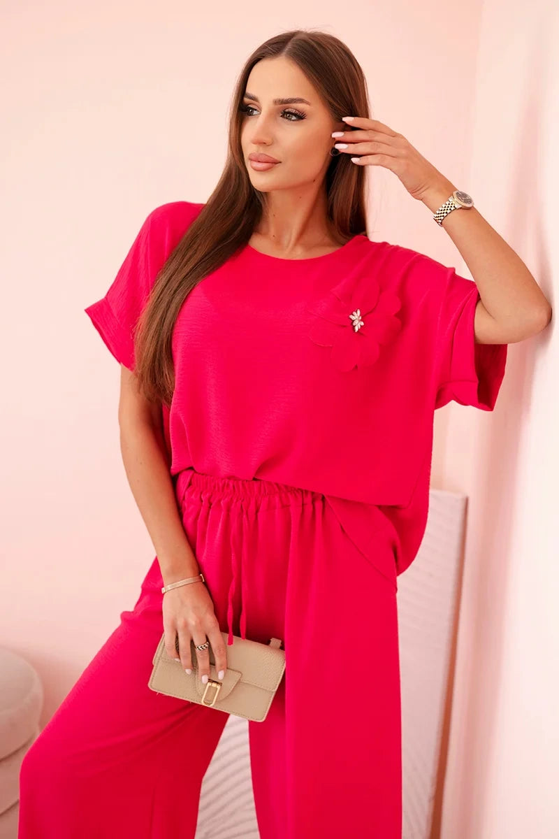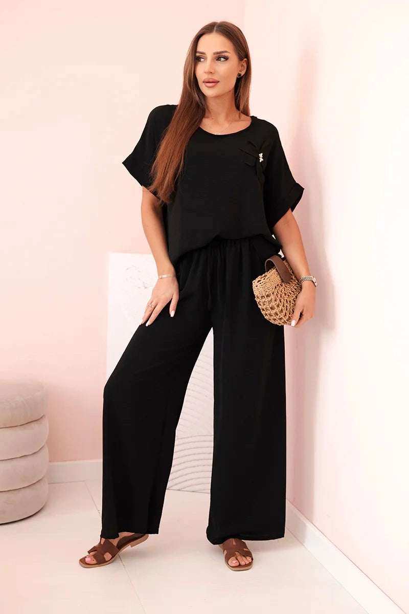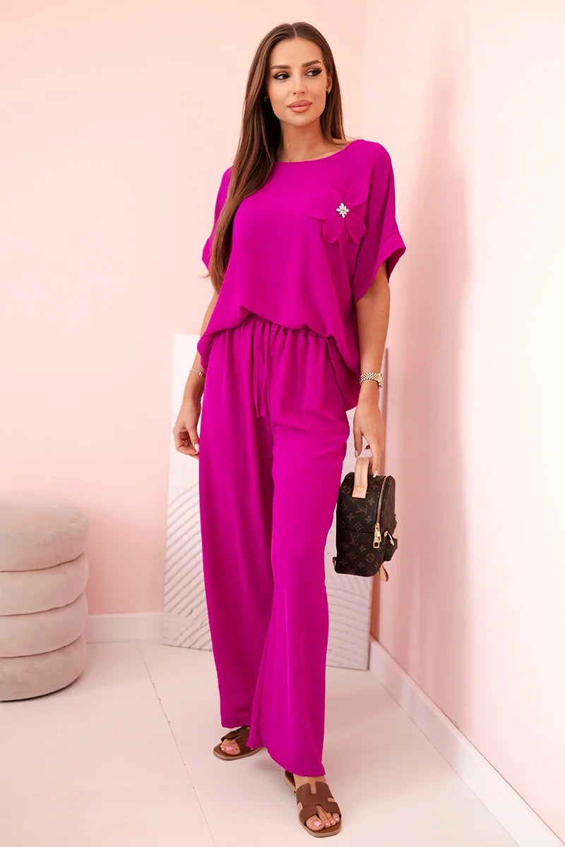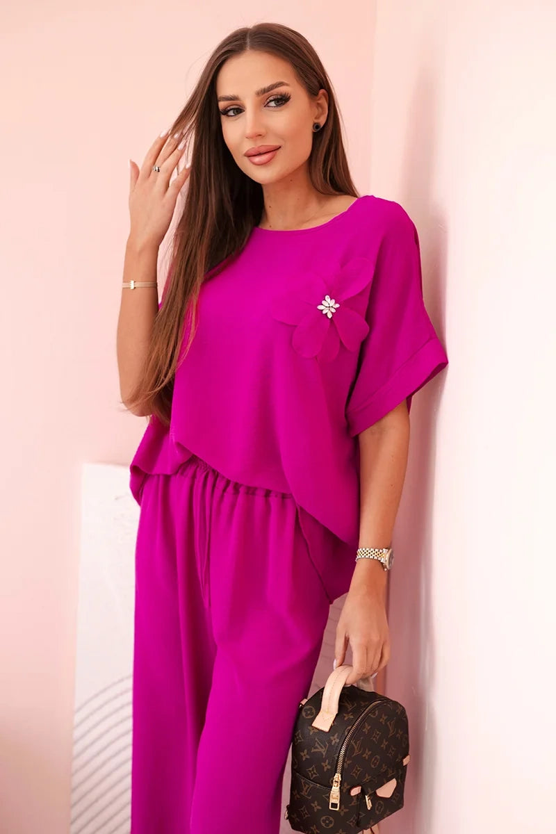 Дамски комплект от вискоза с декоративно цвете и широк панталон ART0109