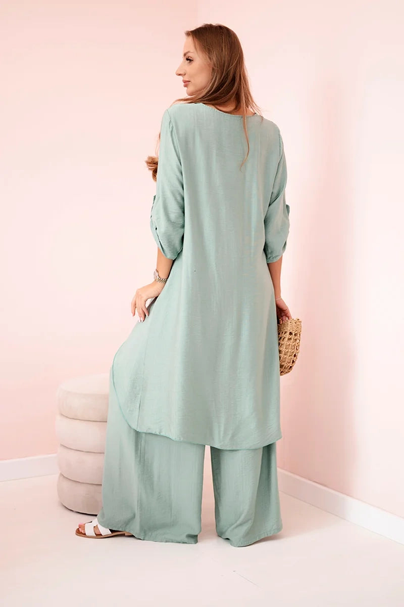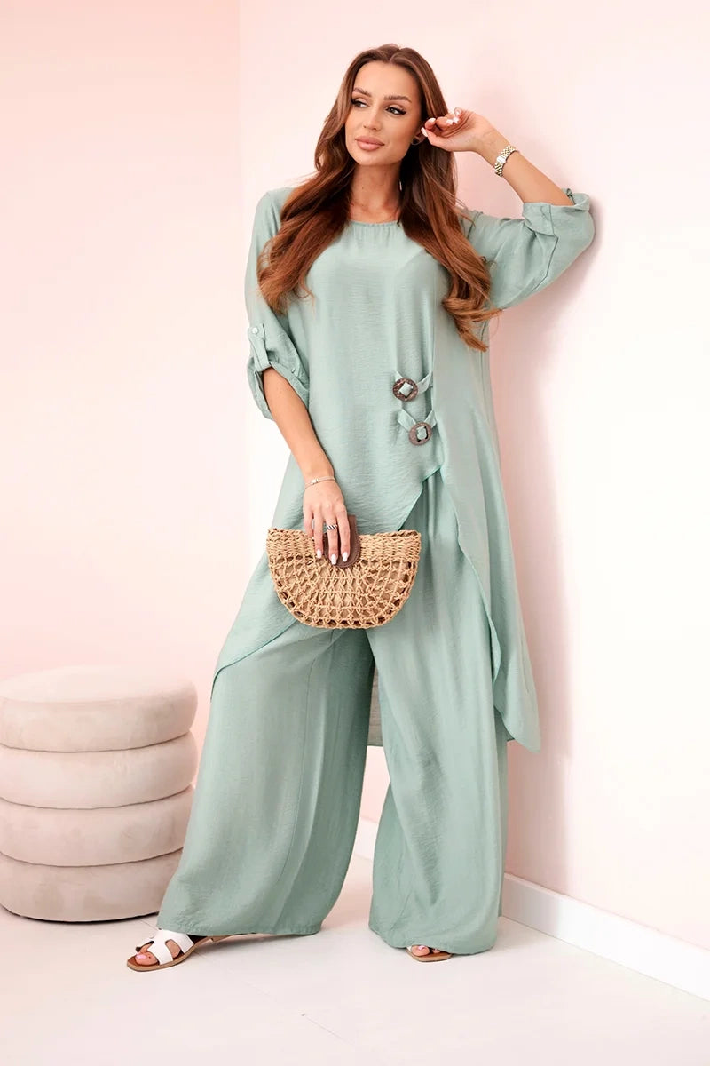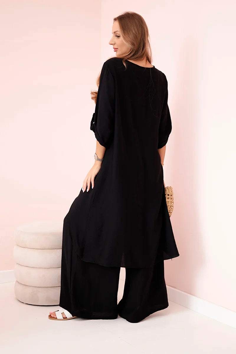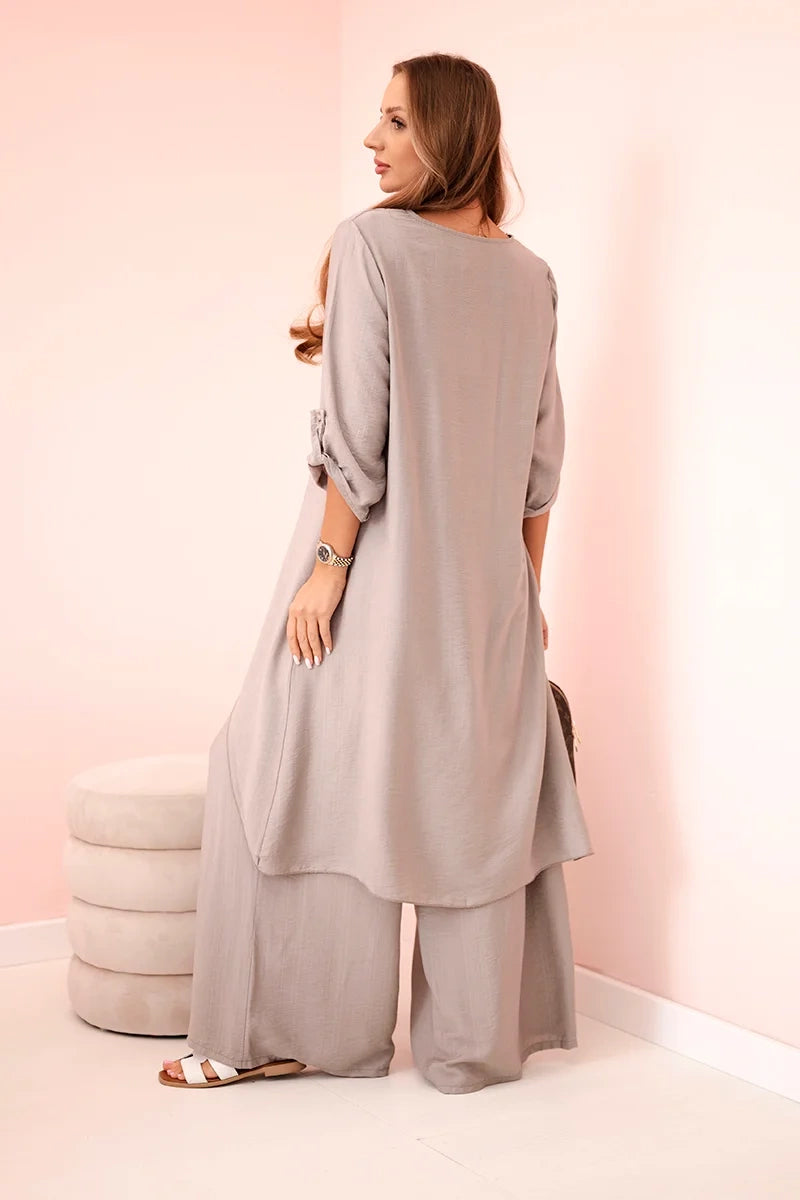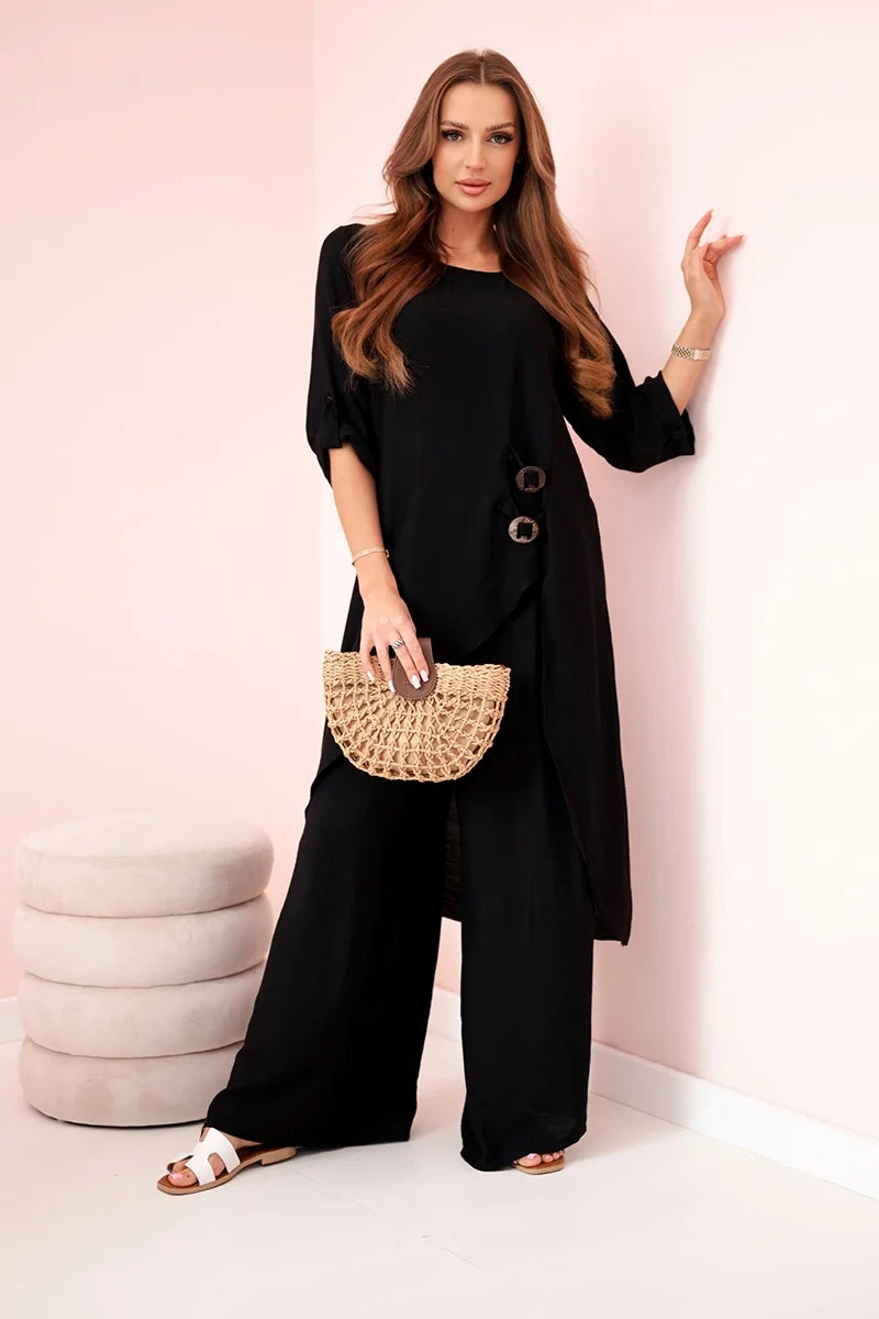 Стилен дамски комплект, състоящ се от лека туника и панталон с широки крачоли, изработен от дишаща вискоза. Туниката е с асиметрична кройка и декоративни връзки отстрани, придаващи уникален характер. 3/4 ръкави с опция за регулиране го правят идеален избор за всеки сезон. Широкият панталон с ластик на талията осигурява комфорт и свобода на движение. Този комплект е идеален както за ежедневно носене, така и за елегантни поводи. Универсалният размер е подходящ за жени, носещи S, M или L.