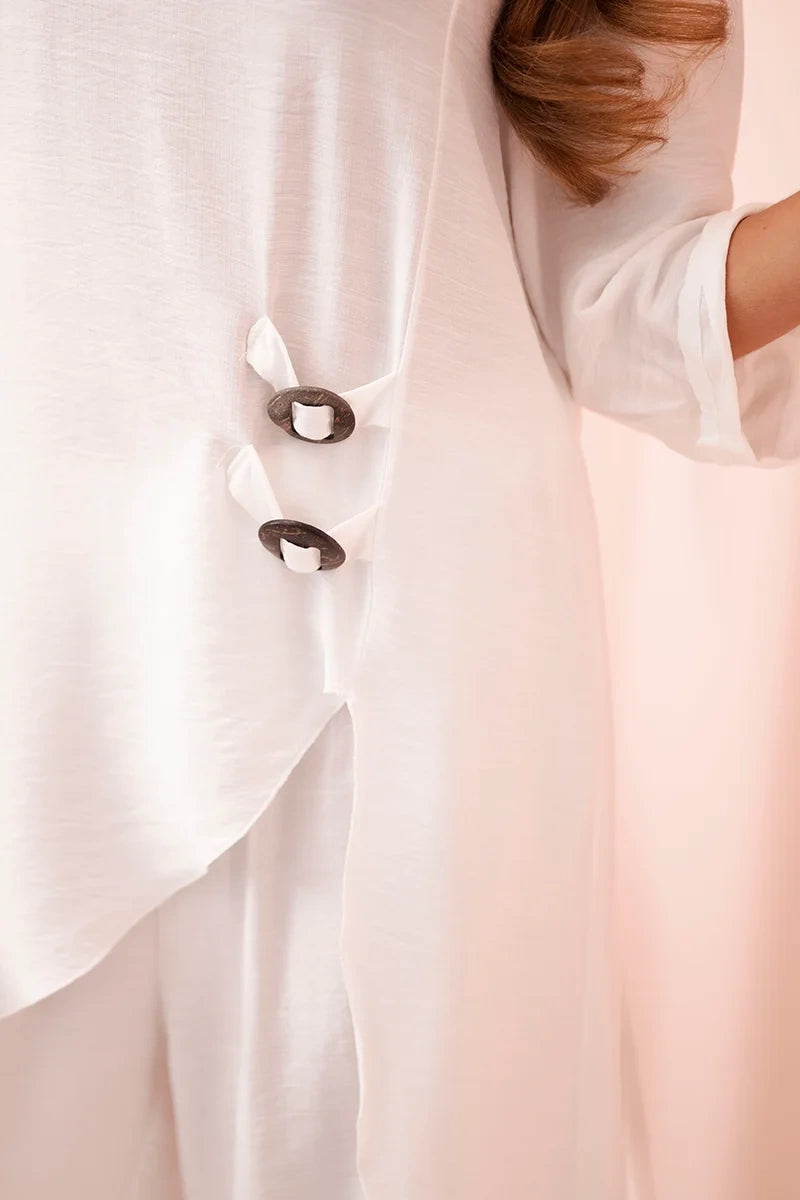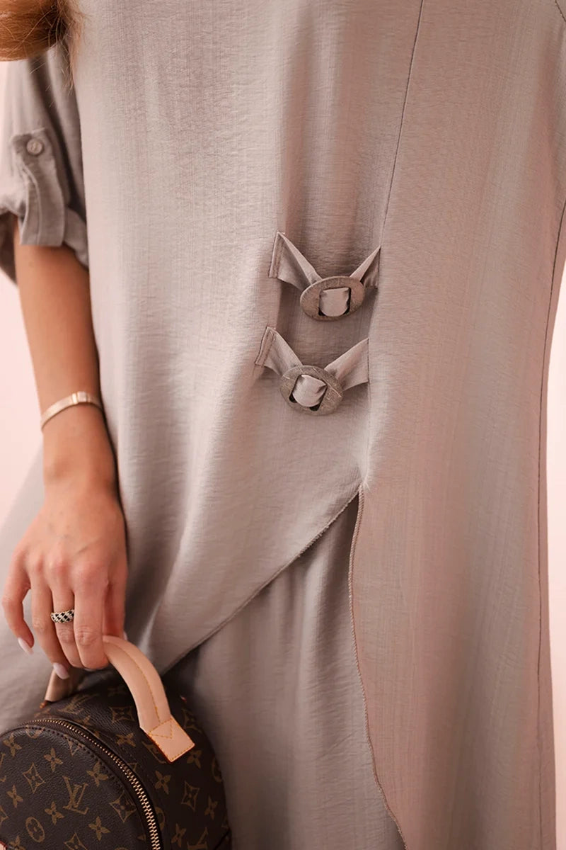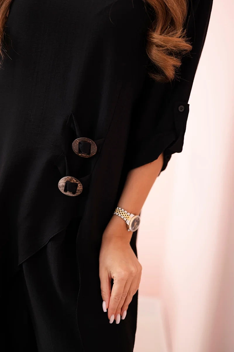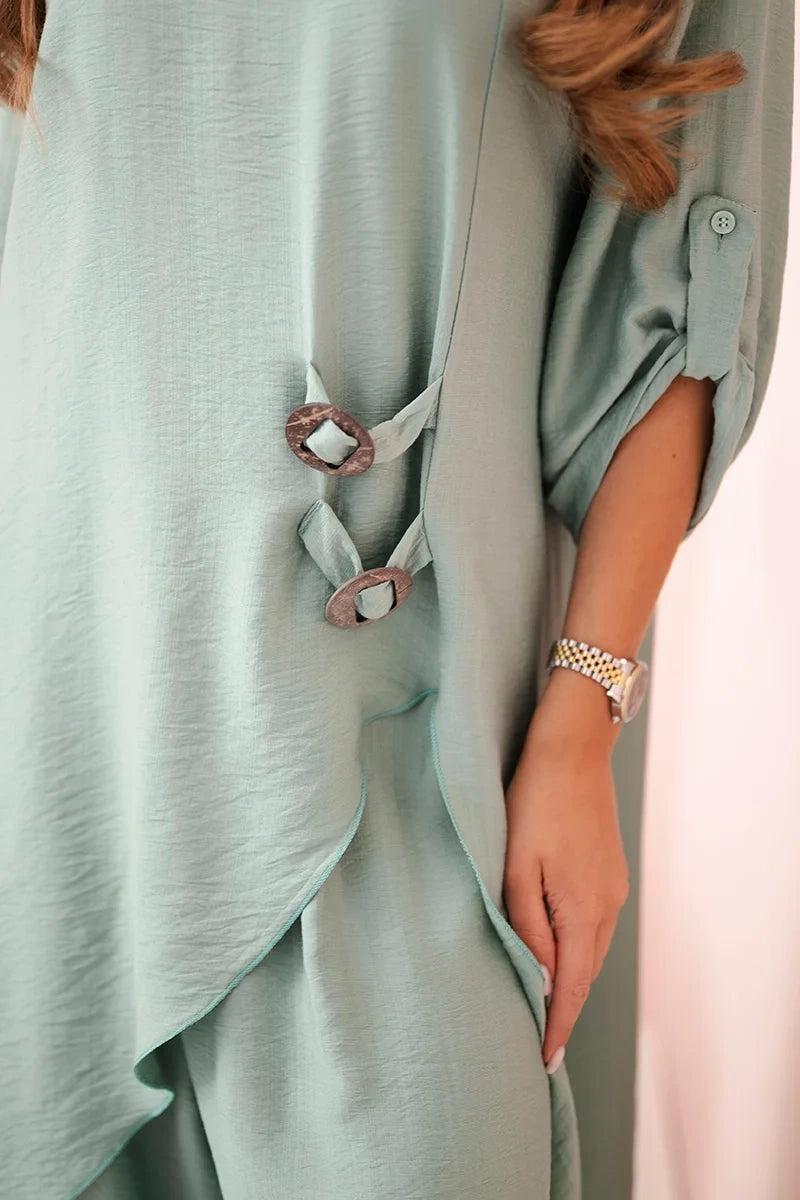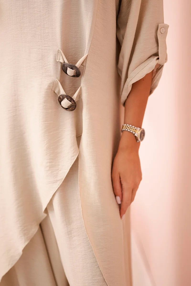 Стилен дамски комплект, състоящ се от лека туника и панталон с широки крачоли, изработен от дишаща вискоза. Туниката е с асиметрична кройка и декоративни връзки отстрани, придаващи уникален характер. 3/4 ръкави с опция за регулиране го правят идеален избор за всеки сезон. Широкият панталон с ластик на талията осигурява комфорт и свобода на движение. Този комплект е идеален както за ежедневно носене, така и за елегантни поводи. Универсалният размер е подходящ за жени, носещи S, M или L.