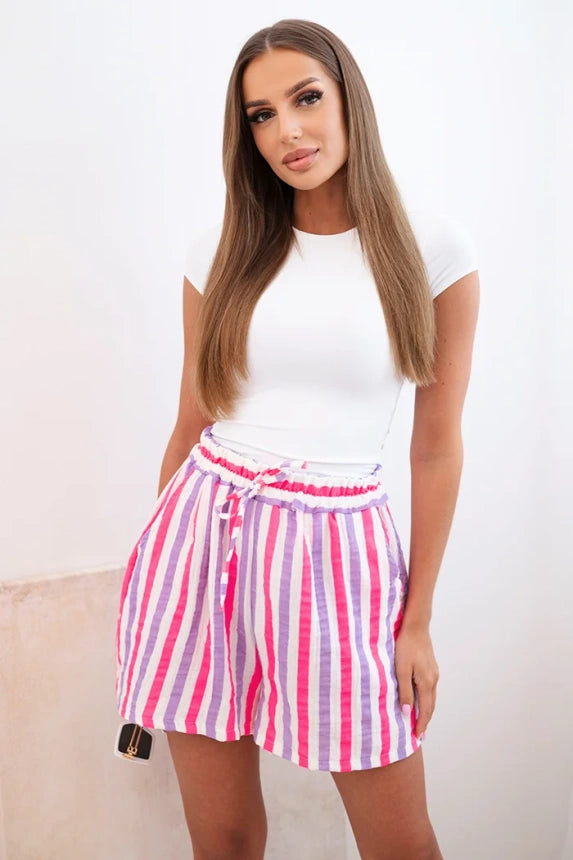 Дамските летни шорти с цветни райета са перфектният избор за топлите дни. Изработени от дишащ 100% памук, те осигуряват максимален комфорт при носене – независимо от повода. Високата талия с ластик и декоративна връзка осигурява перфектно прилягане, а свободната кройка позволява свобода на движение, добавяйки лекота и удобство. Този модел е чудесен както за почивка, така и за ежедневни разходки или срещи с приятели. Ярките цветове и вертикалните райета визуално изтъняват фигурата, а страничните джобове добавят практичност. Задължителен елемент от летния гардероб на всяка жена! Размерът е универсален и ще подхожда на жени с размери S, M или L.