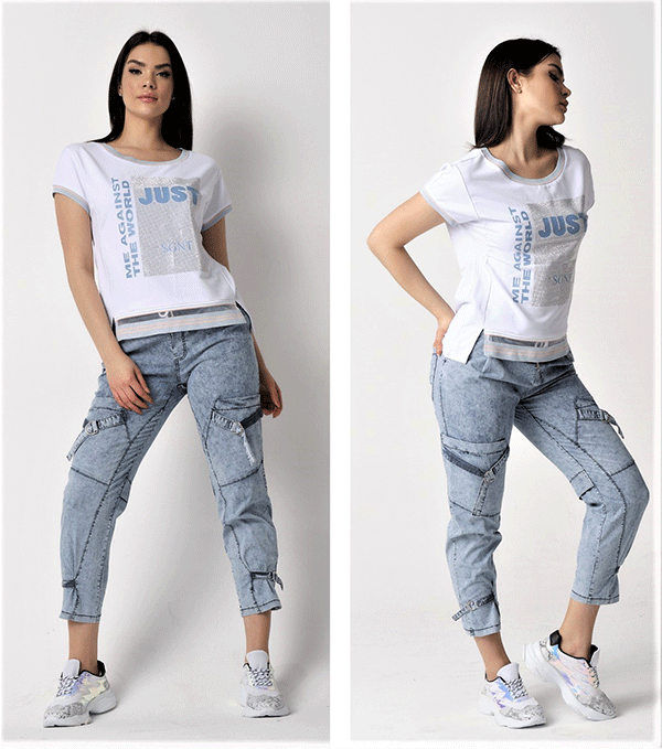 Блузата е бяла с надписи отпред, с къси ръкави.