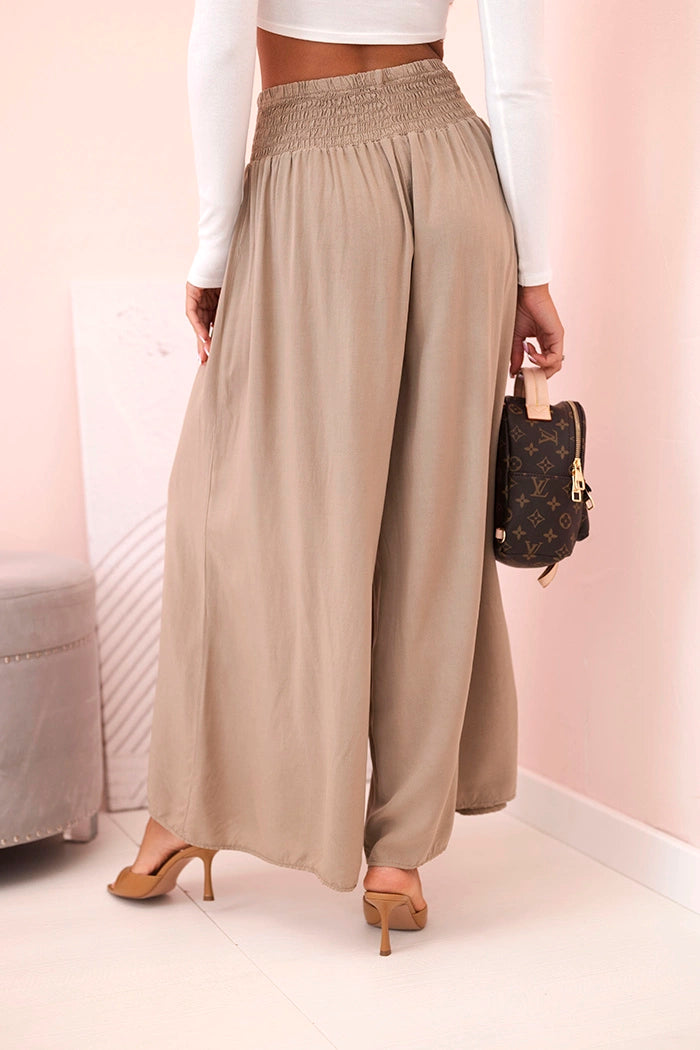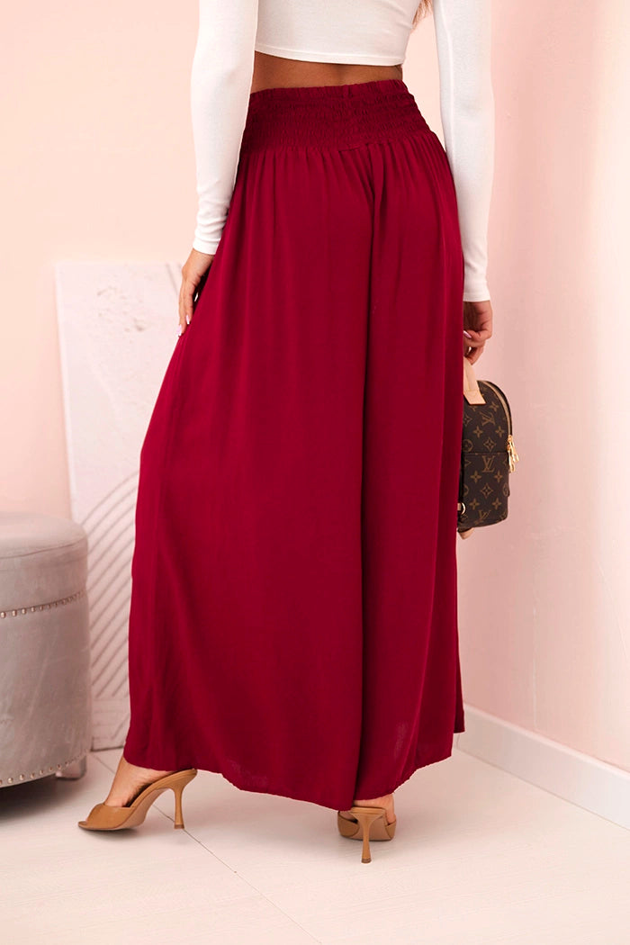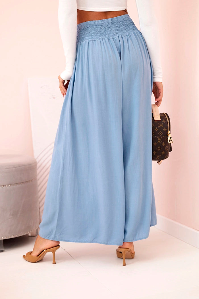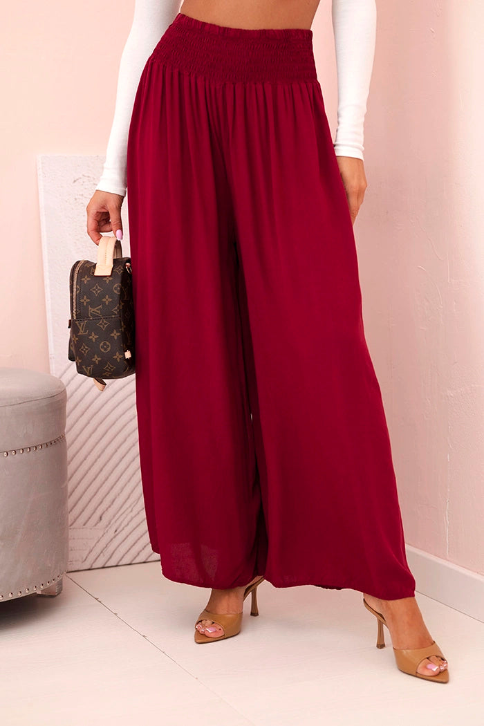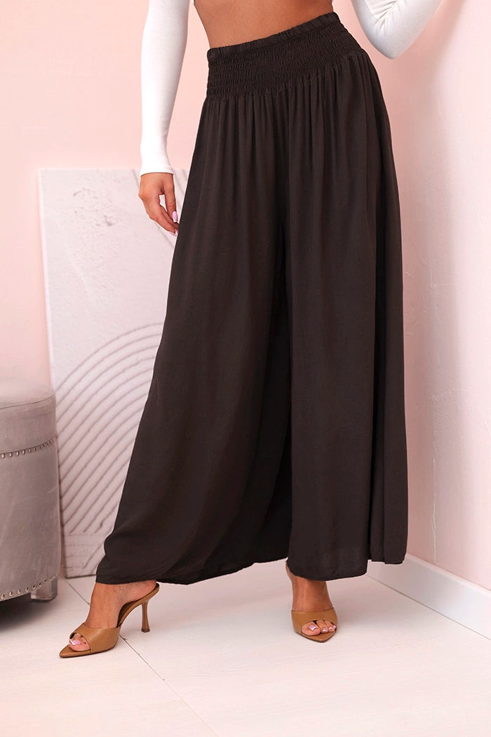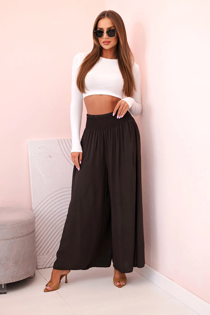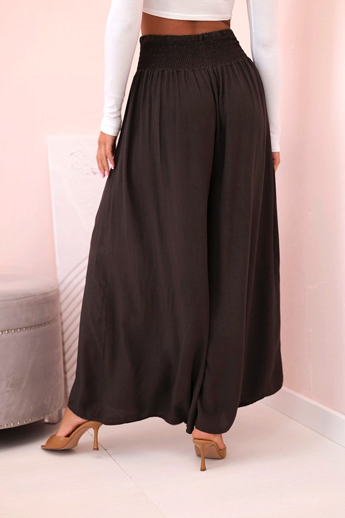 Ако търсите удобни и стилни панталони за ежедневно носене или за почивка, тези дамски панталони палацо са перфектният избор! Изработени от 100% лека, дишаща вискоза, те не само осигуряват комфорт при носене, но и красиво оформят силуета. Широкият крачол и разкроената кройка добавят лекота и елегантност към всяко движение, а еластичната талия приляга перфектно на талията. Идеални за разходка, пазаруване или плаж – просто добавете семпъл топ и сте готови! Универсален модел, който си струва да имате в гардероба си. Размерът е универсален и ще подхожда на жени, носещи S, M или L.