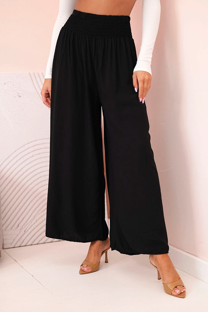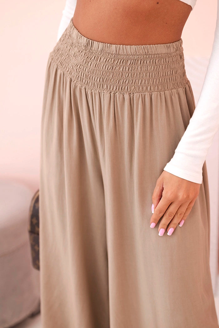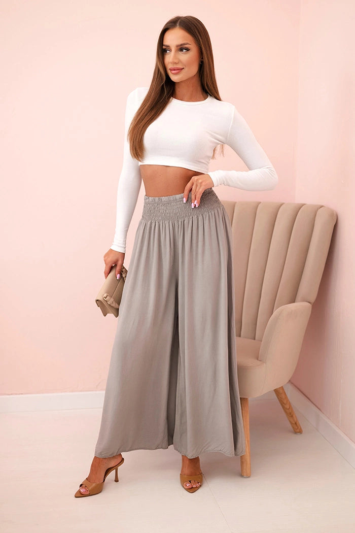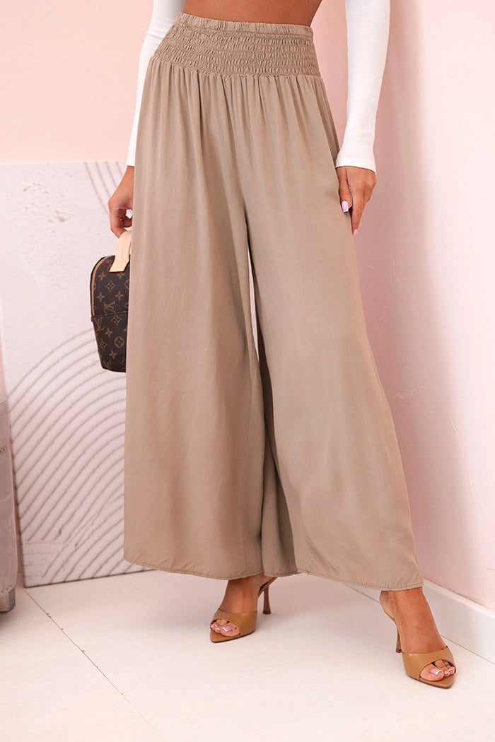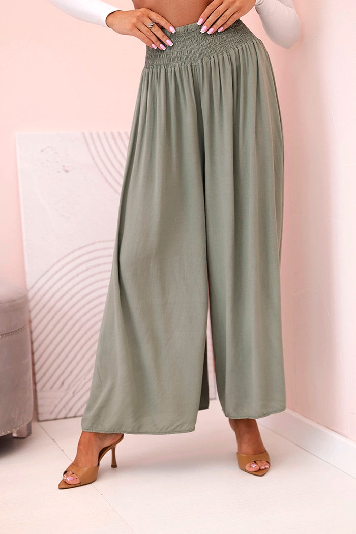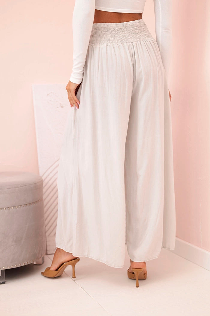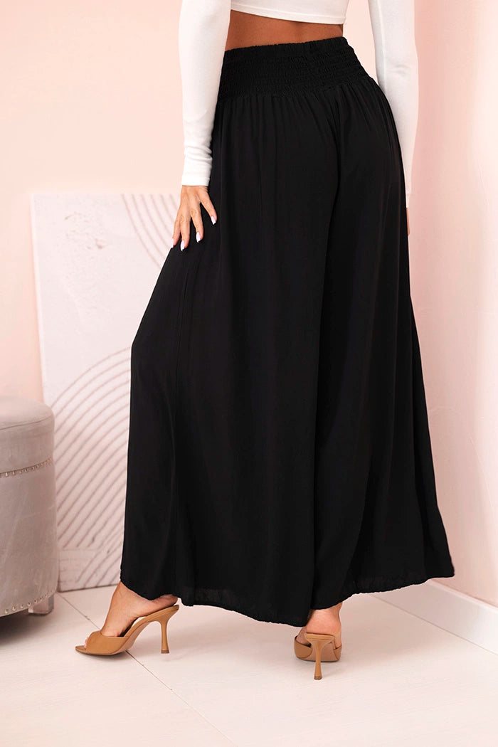 Ако търсите удобни и стилни панталони за ежедневно носене или за почивка, тези дамски панталони палацо са перфектният избор! Изработени от 100% лека, дишаща вискоза, те не само осигуряват комфорт при носене, но и красиво оформят силуета. Широкият крачол и разкроената кройка добавят лекота и елегантност към всяко движение, а еластичната талия приляга перфектно на талията. Идеални за разходка, пазаруване или плаж – просто добавете семпъл топ и сте готови! Универсален модел, който си струва да имате в гардероба си. Размерът е универсален и ще подхожда на жени, носещи S, M или L.