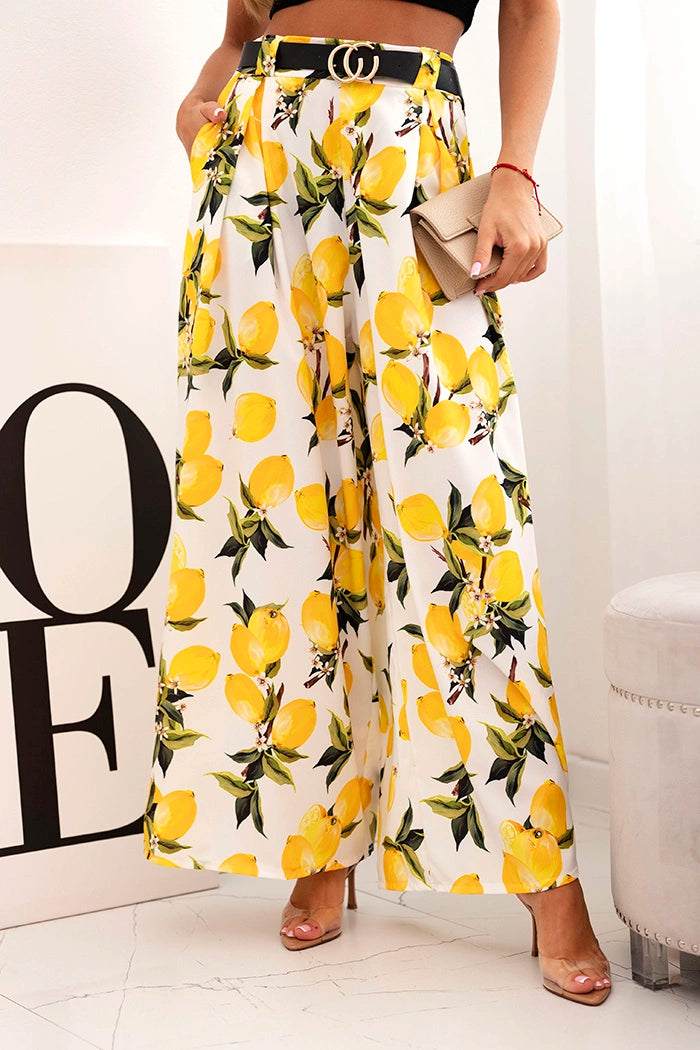 Добавете нотка летен чар към гардероба си с тези уникални дамски панталони с широки крачоли и привличащ вниманието лимонов принт. Тези стилни панталони са перфектният избор за жени, които ценят оригиналността и комфорта в ежедневната мода. Леката материя и еластичната талия ги правят удоволствие за носене – както за ежедневно ползване, така и за специални поводи в по-топло време. Панталоните се открояват не само с отличителния си модел, но и с елегантен колан и декоративна катарама, които подчертават талията и придават характер. Свободната кройка с широки крачоли осигурява свобода на движение и се съчетава добре както с вталени блузи, така и с по-свободни топове. Размерът е универсален и е подходящ за жени, носещи размер M или L.