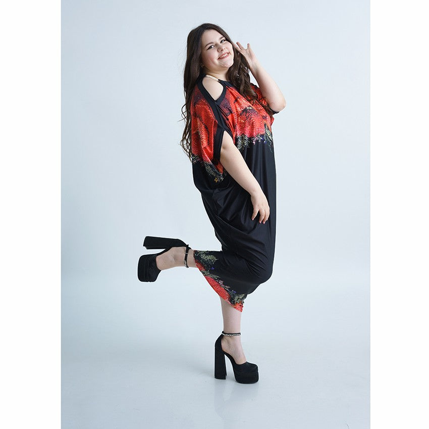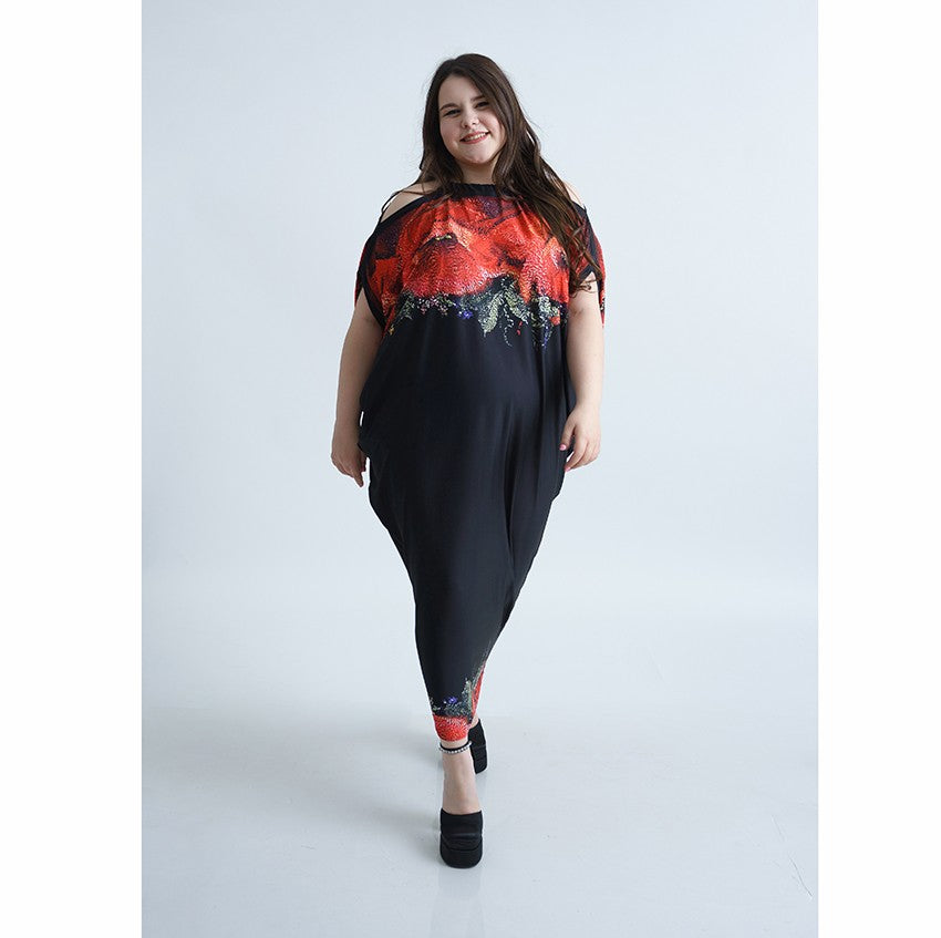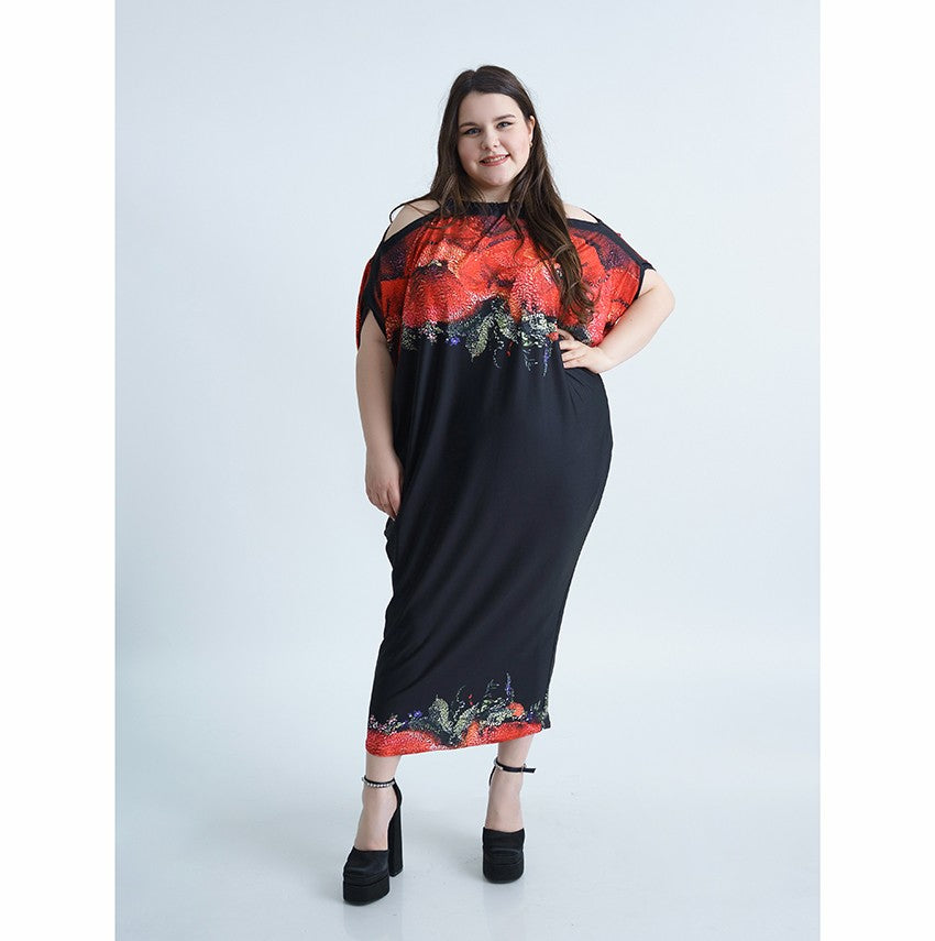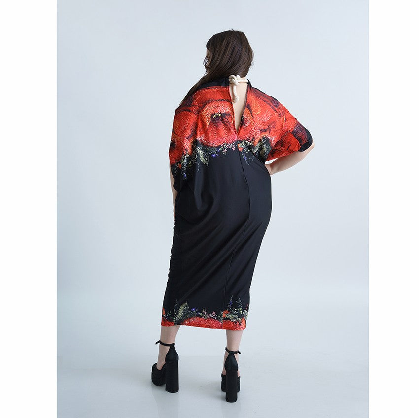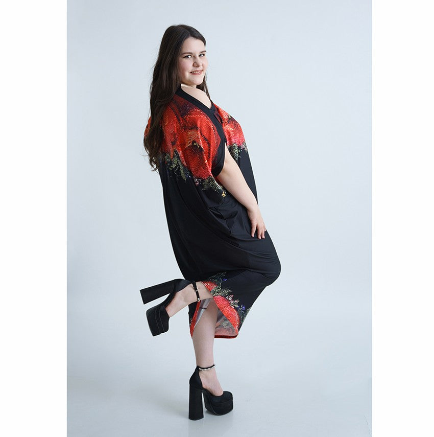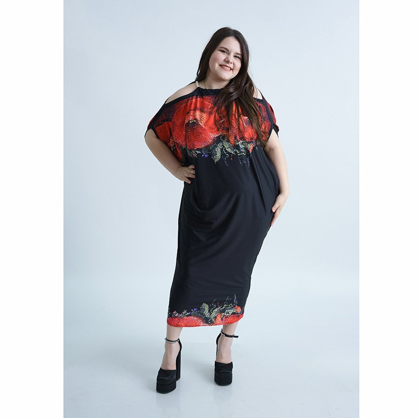 Дълга черна лятна рокля Атина. Рокля с прилеп ръкав стеснена надолу. Завързване на врата. Еластична материя.