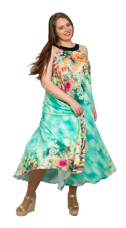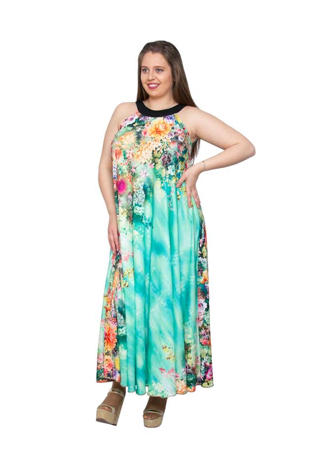 Дълга лятна рокля Флоренс в красив десен в синьо-зелен цвят, украсен с флорални мотиви.