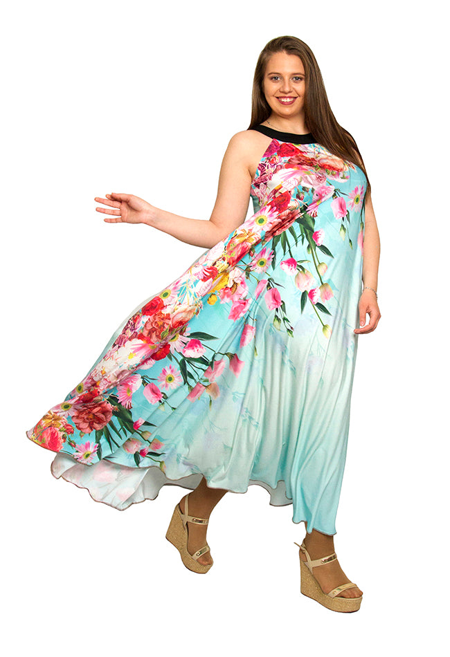 Дълга лятна рокля Грация в красив десен в син цвят, украсен с флорални мотиви.